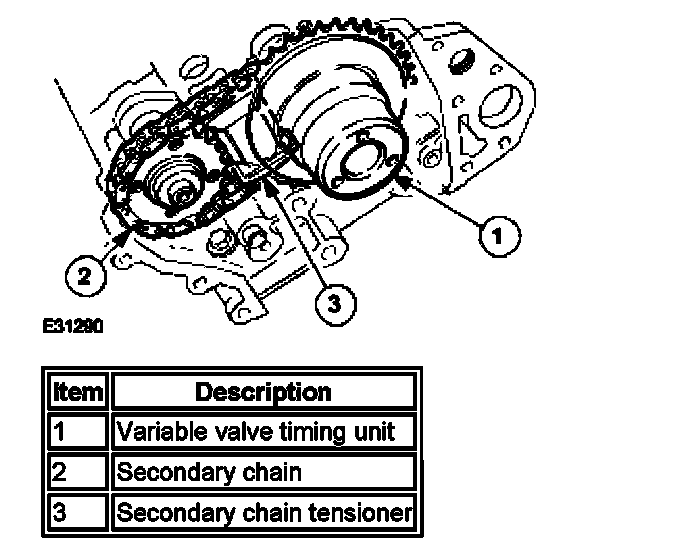Multi link primary and single link secondary chains drive the camshafts of each cylinder bank. The primary chains transmit the drive from sprocket on the crankshaft to a sprocket on each intake camshaft. The secondary chains transmit the drive from a second, smaller sprocket on the intake camshaft to a sprocket on the exhaust camshaft.