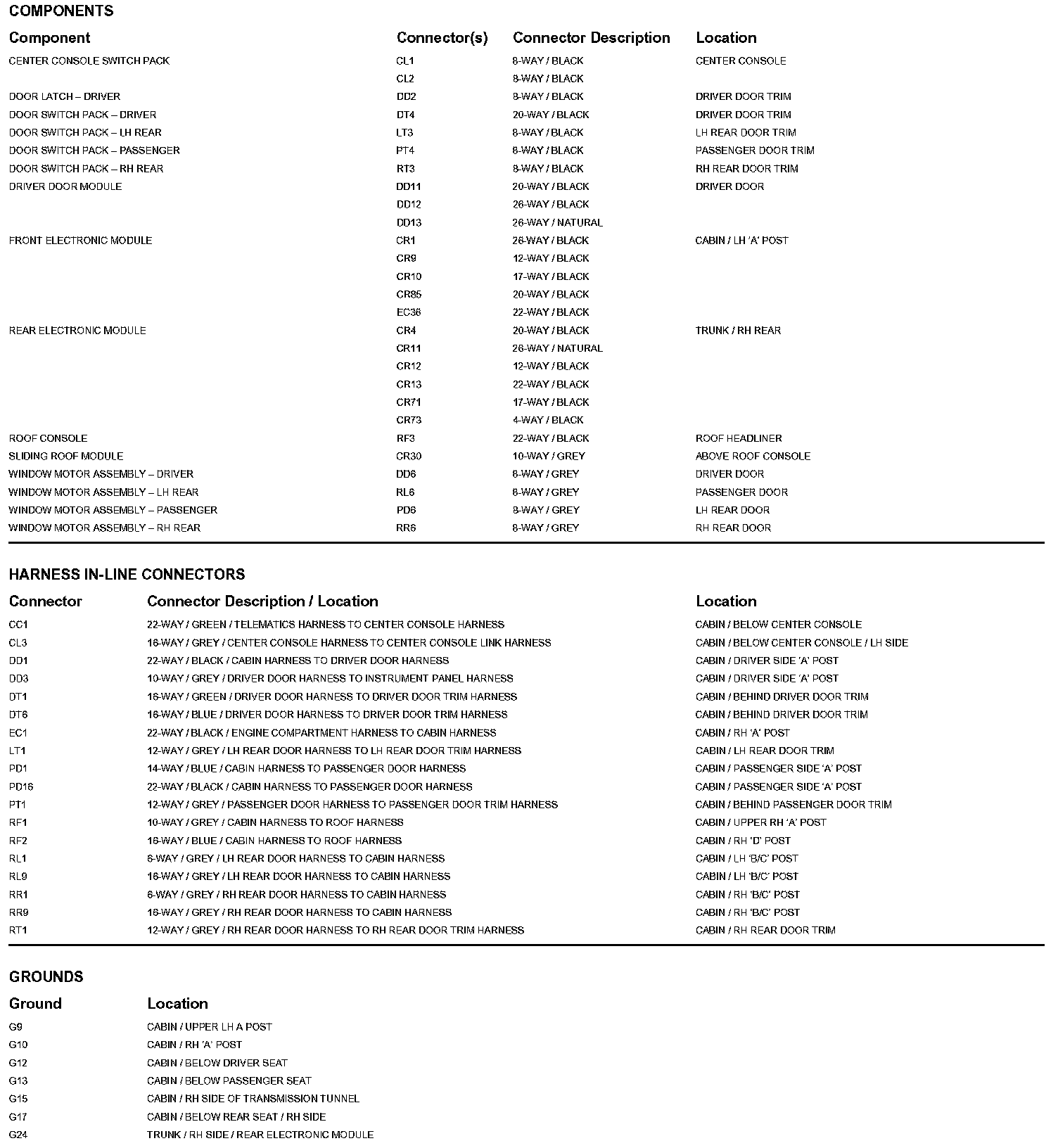 Locations: The location views for Ground Points, In-Line Harness Connectors, Harnesses, and Control Modules depicted within these diagrams can be found at Vehicle/Locations. Locations