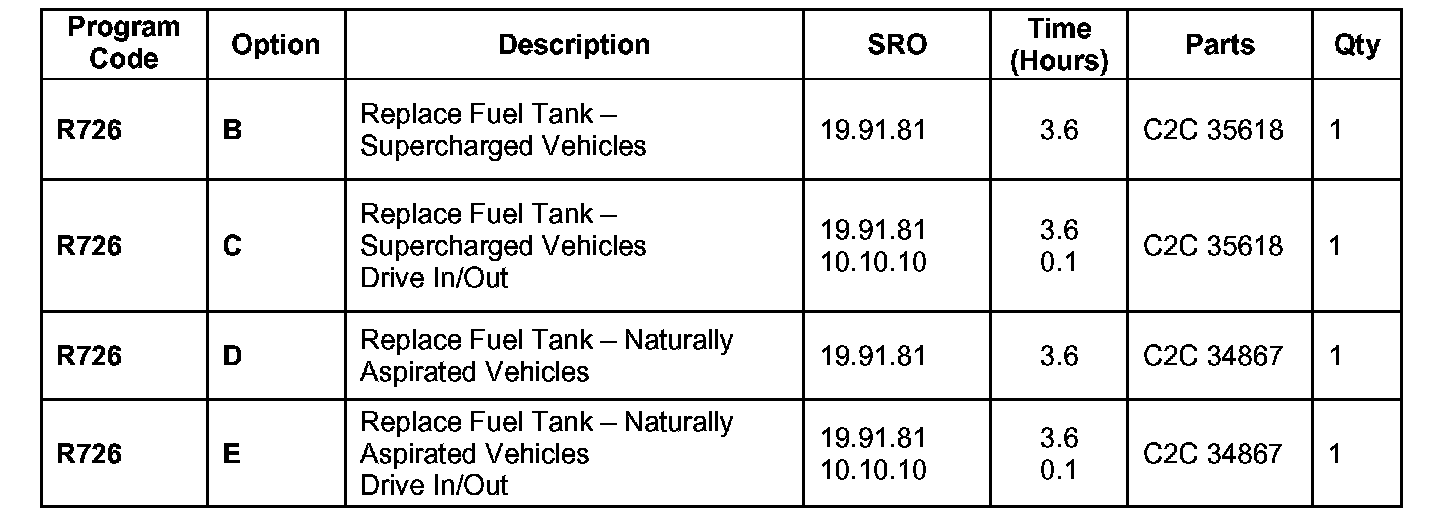 Sold vehicles will be subject to the standard customer recall notification to be issued the week of October 29th. Refer to Service Administration Bulletin 7-38U5A or 7-38CAN "Safety Recall R726 - Fuel Tank Replacement" for additional information. Dealers are to remove the existing tank on affected vehicles and replace it with a new specification tank assembly as outlined in the Repair Procedure section of this bulletin.