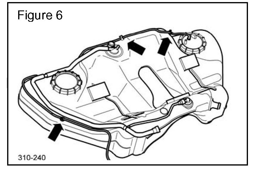 15. Install the vent tube fully onto the retaining clips on the tank. (Arrowed in Figure 6)