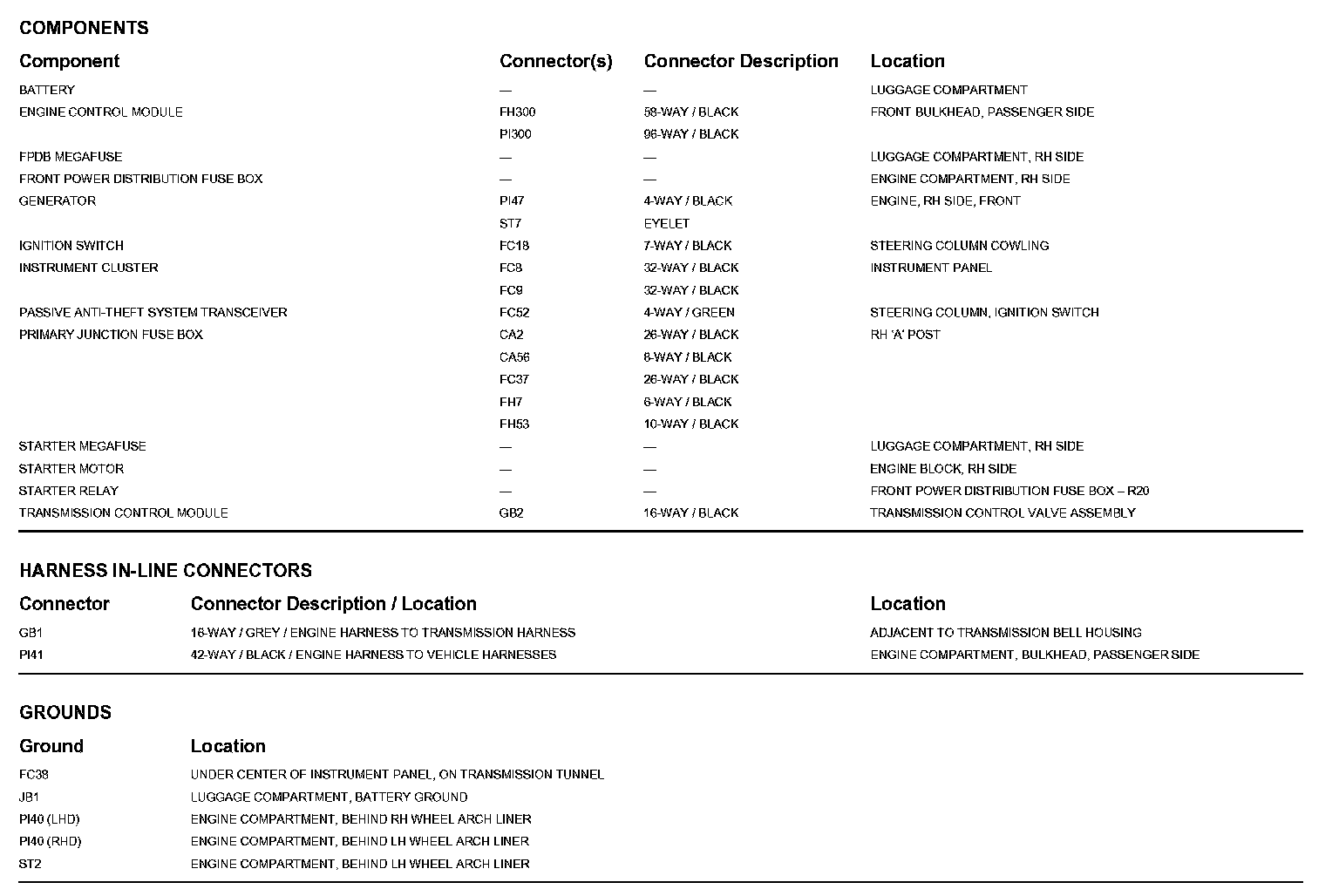 Locations: The location views for Ground Points, In-Line Harness Connectors, Harnesses, and Control Modules depicted within these diagrams can be found at Vehicle/Locations. Locations