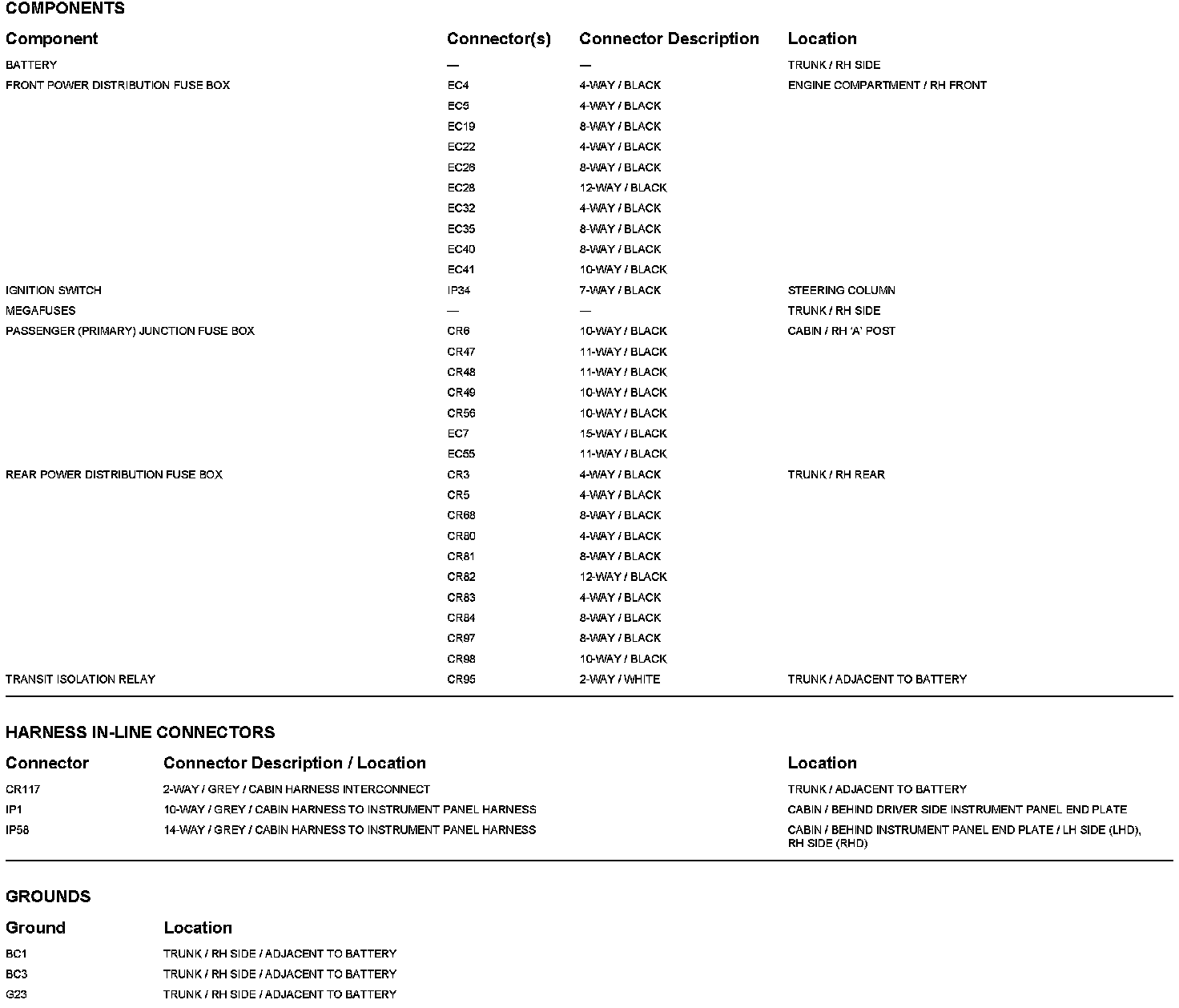Locations: The location views for Ground Points, In-Line Harness Connectors, Harnesses, and Control Modules depicted within these diagrams can be found at Vehicle/Locations. Locations
