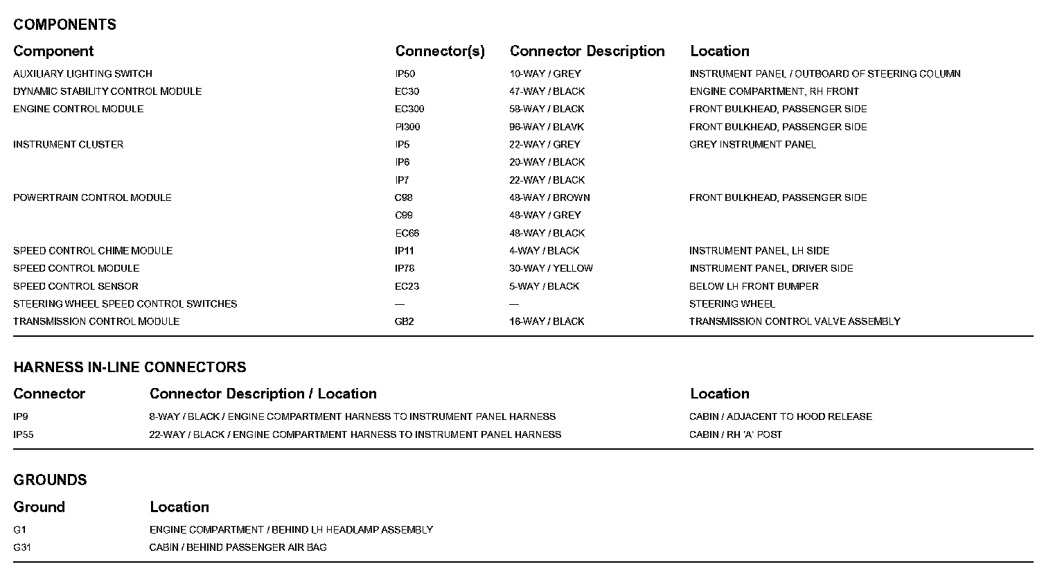 Locations: The location views for Ground Points, In-Line Harness Connectors, Harnesses, and Control Modules depicted within these diagrams can be found at Vehicle/Locations. Locations
