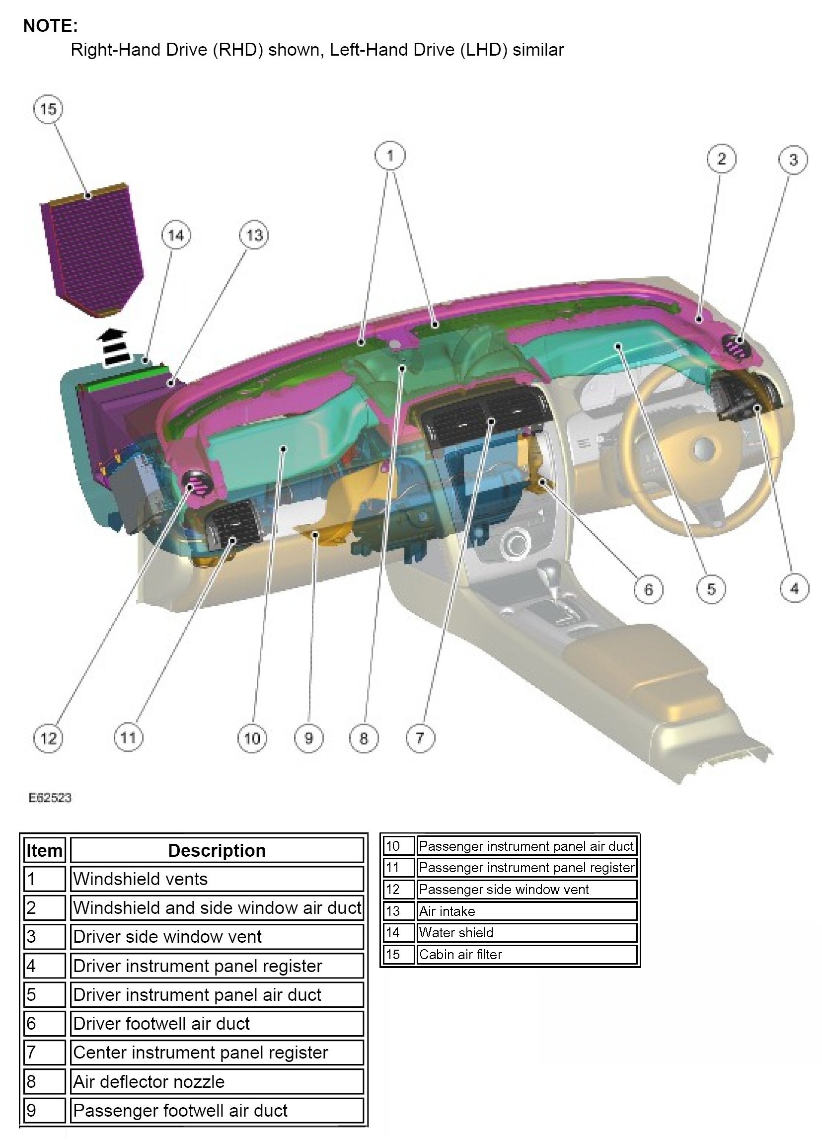 The air ducts distribute air from the heater assembly to the various registers and vents in the instrument panel. The windshield and side window air duct, the driver instrument panel air duct, and the passenger instrument panel air duct all form part of the structure of the instrument panel.