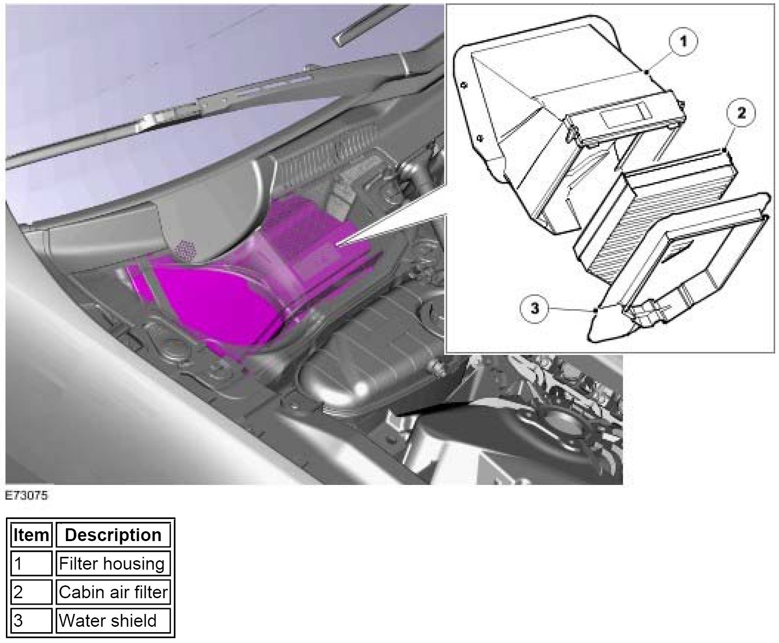The cabin air filter is located in a plastic housing on the passenger side of the engine compartment. The filter removes odours and fine particles, including pollen, from air entering the blower assembly.