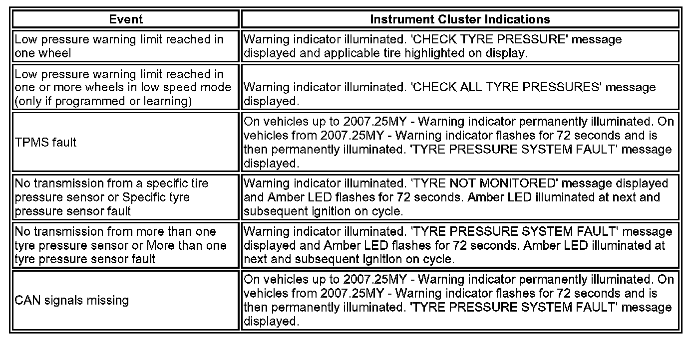 If a TPMS fault warning message is detected by the instrument cluster at ignition on, the warning indicator will illuminate on vehicles up to 2007.25MY and will flash on vehicles from 2007.25MY for 72 seconds after the 3 second bulb check period and then remain permanently illuminated.