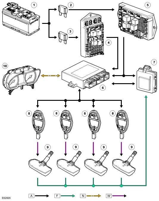 The system comprises a TPMS module, a Radio Frequency (RF) receiver, 4 initiators and 4 tire pressure sensors (the space saver spare wheel is not fitted with a sensor).