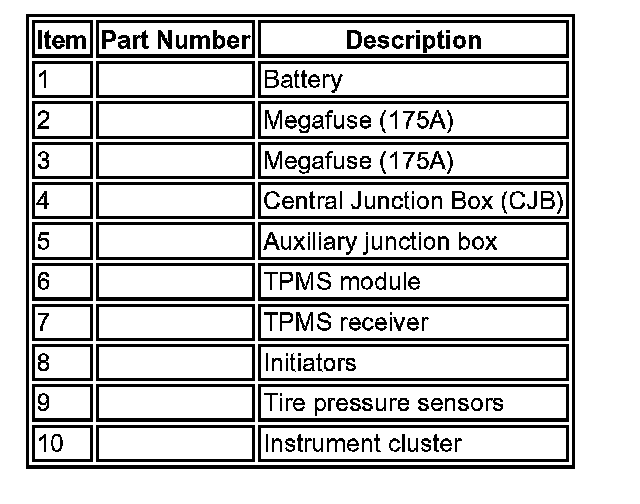 The TPMS module is located behind the Left Hand (LH) rear passenger seat, behind the Auxiliary Junction Box (AJB) and the TPMS RF receiver is located on the AJB mounting bracket. The front initiators are positioned at the front of the wheel arches, behind the fender splash shields. The rear initiators are positioned at the rear of the rear wheel arches, behind the fender splash shields.