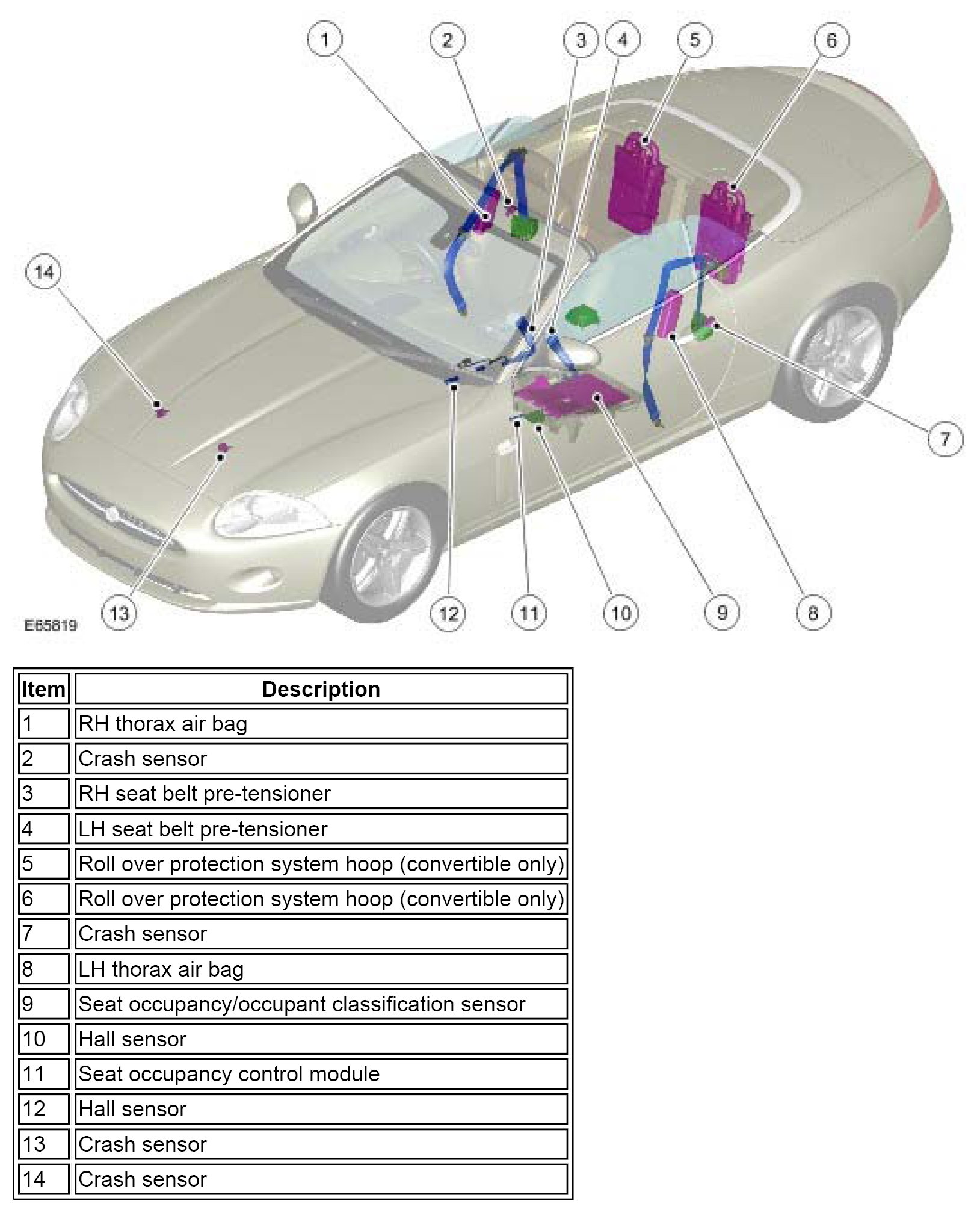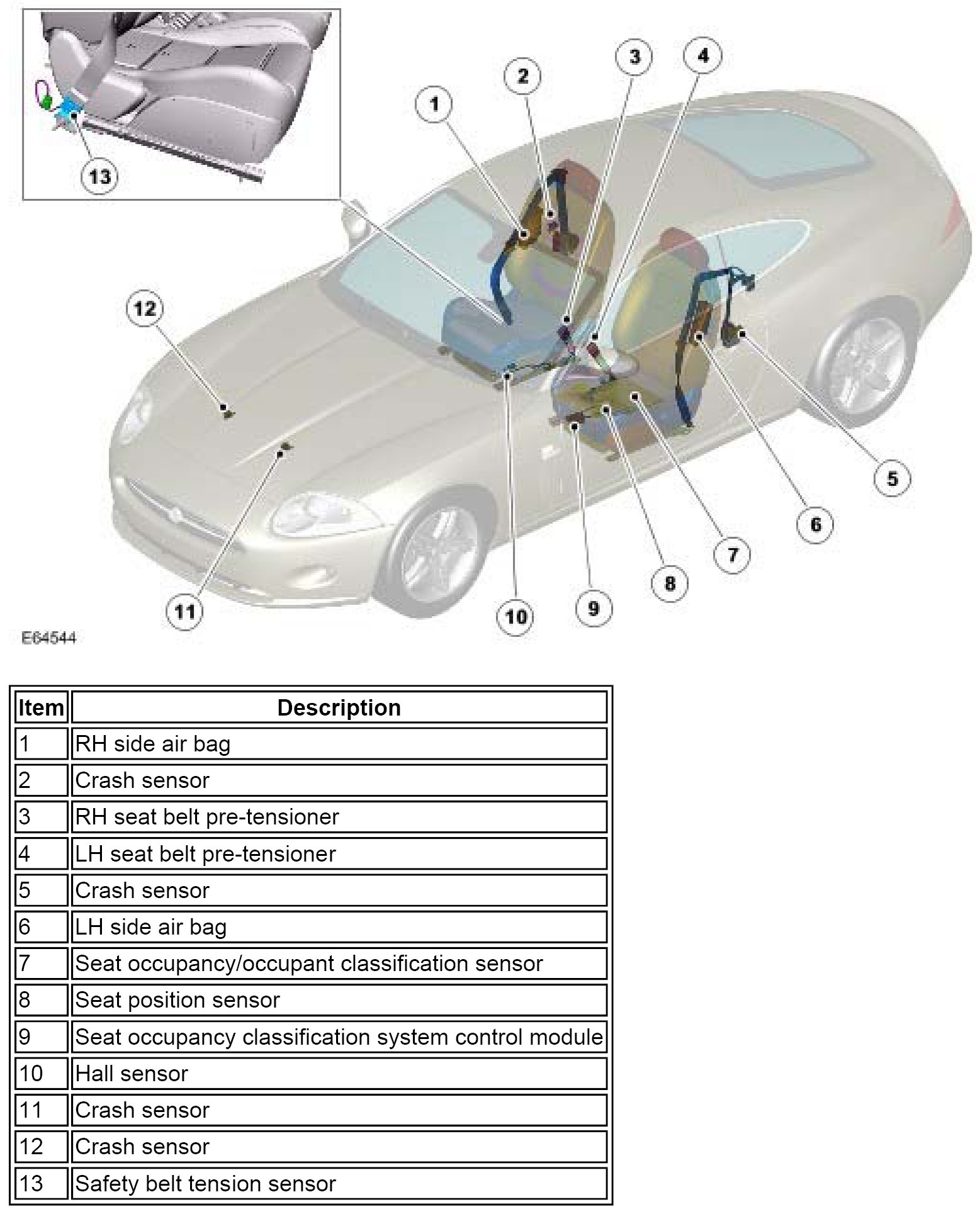 The buckle of each front safety belt incorporates a Hall effect sensor that provides a safety belt status signal to the RCM. The RCM broadcasts the status of the two front safety belts on the high speed controller area network (CAN) bus for use by the instrument cluster. In the event of a front impact the RCM will deploy the pretensioners provided the safety belt buckles are fastened. The safety belt buckle pretensioners have a lower deployment threshold than that required by the air bags. Hence it is possible during a minor collision, which exceeds the deployment threshold, that only the safety belt buckle pretensioners will deploy.