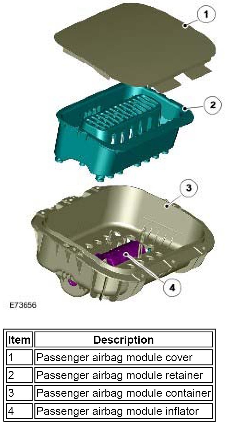 The passenger air bag module is controlled by the RCM which chooses between single or dual stage deployment, depending on the occupant status and the crash severity. It consists of a two stage inflator with two air bag electrical connectors to accommodate the two stage inflation.