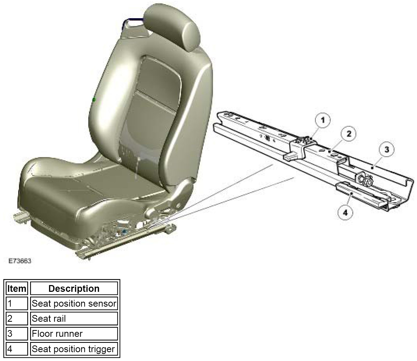 The seat position sensor allows the RCM to detect when the driver seat is forward of a given point on the seat track. The seat position sensor consists of a Hall effect sensor attached to the driver seat frame and a target plate on the seat base. While the ignition is on, the RCM supplies the sensor with a power supply of 12 V nominal, and monitors the return voltage. When the seat frame moves forwards, the sensor moves over the target plate, which changes the reluctance of the sensor. The change of voltage is detected by the RCM and used as a switching point. The switching point is when the center of the sensor is 3 ± 4 mm from the leading edge of the target plate.