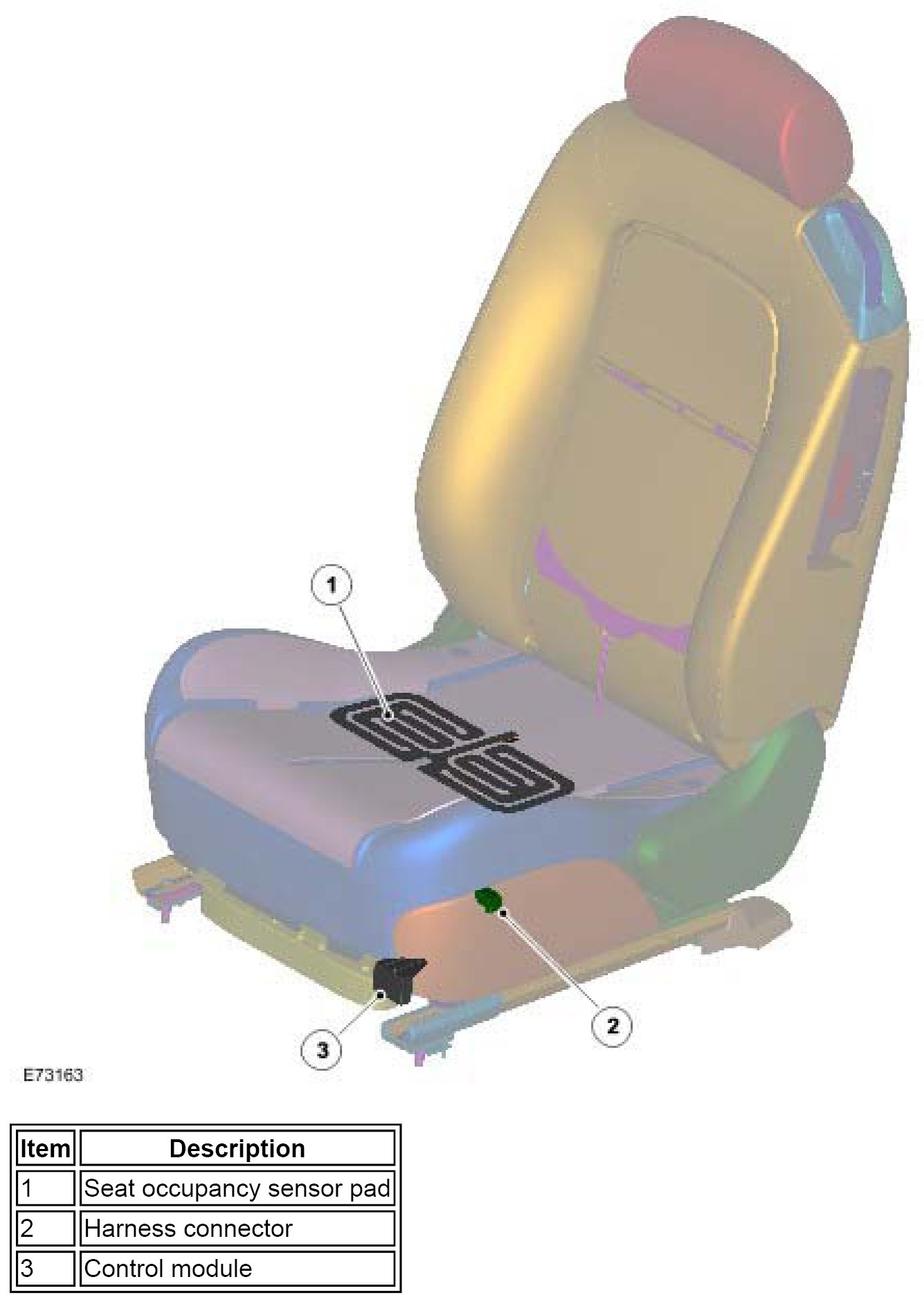 The occupant detection system can only determine if the front passenger seat is occupied or unoccupied. The occupant detection system consists of a captive sensor mat installed between the foam padding and the cover of the front passenger seat cushion and a control module.