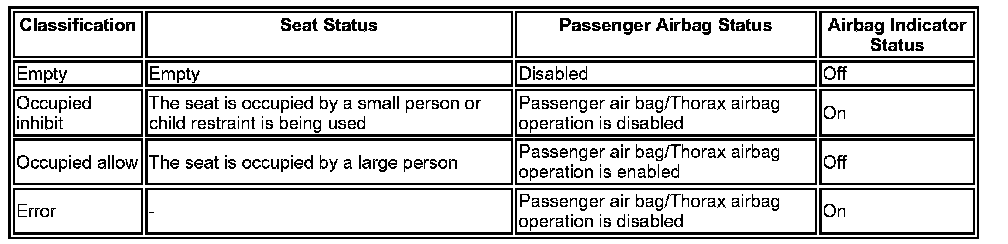 For markets that have an occupant classification system, this provides the RCM with the occupancy status of the front passenger seat. The restraints control module uses this and the seat buckle status in the evaluation of the firing strategy for the passenger front air bag, side air bag, and pretensioner.