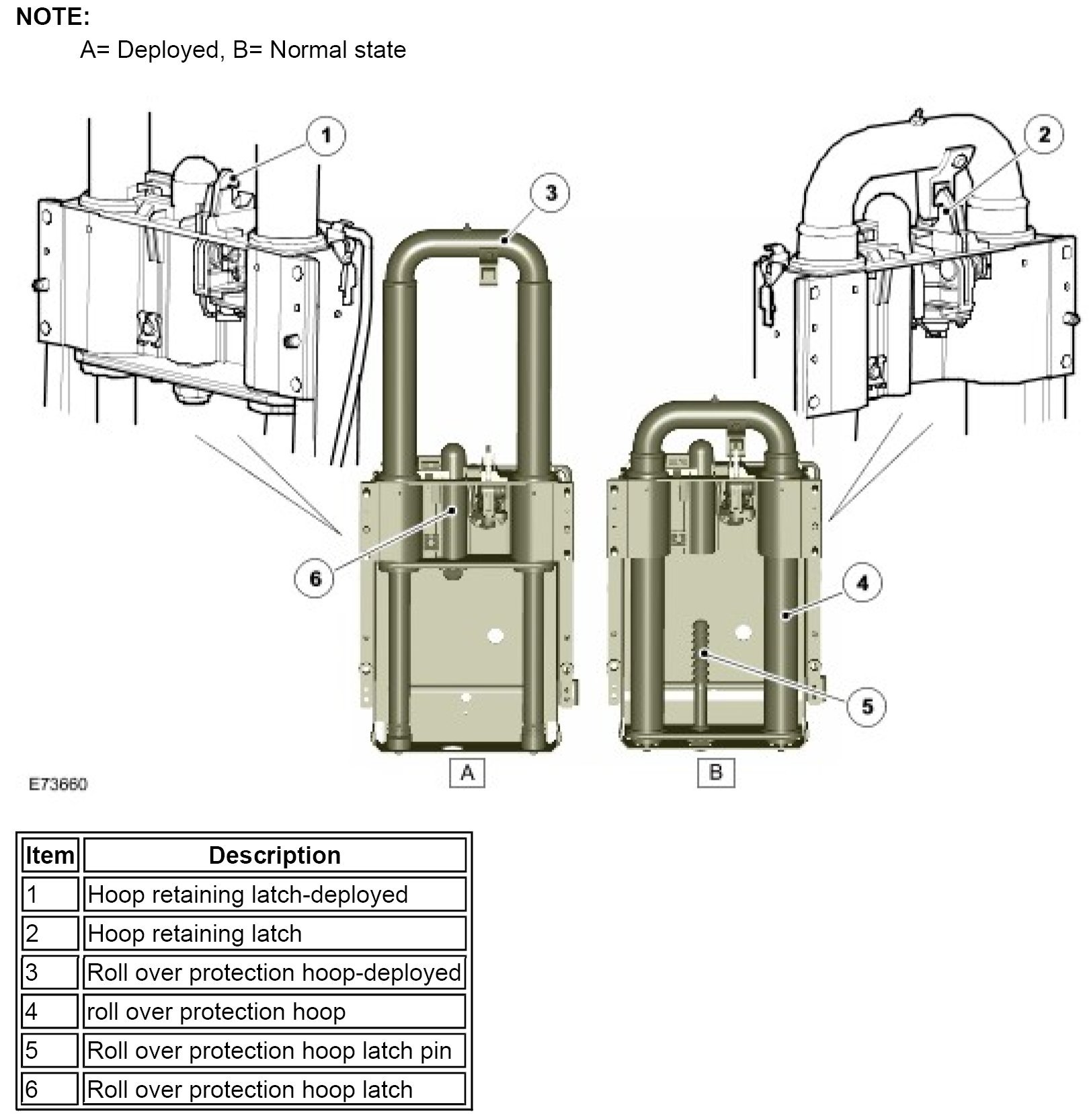 The roll over protection system hoops are located behind the rear seat underneath the tonneau cover. The tonneau cover has two hatches set into it to allow the hoops to break through once triggered. The hoops are spring loaded and held in place by a pyrotechnic latch. The latch is fired in response to a trigger from the RCM. Once fired the latch opens and the hoops are released. As the hoops move upwards a ratchet in the body of the hoops locks into place and prevents the hoops from being forced back down by the weight of the vehicle. Once deployed the hoops cannot be re-set and should be replaced with new components.