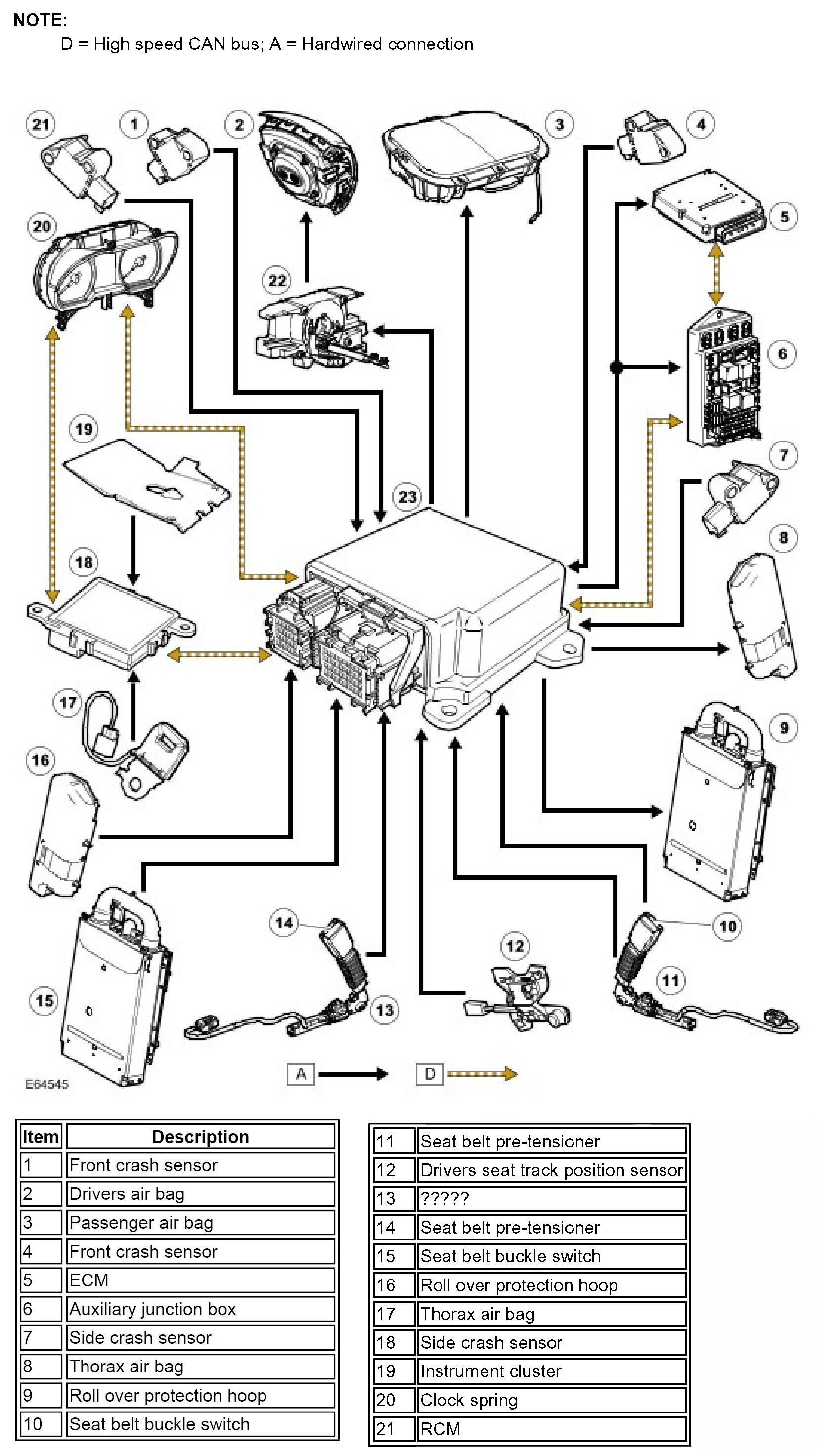 When the RCM (restraints control module) outputs any of the fire signals, it also outputs a hard wired crash signal to the ECM (engine control module) and changes the high speed CAN (controller area network) bus output message from 'no crash' to 'crash condition'. The high speed CAN (controller area network) bus message is used by the CJB (central junction box).