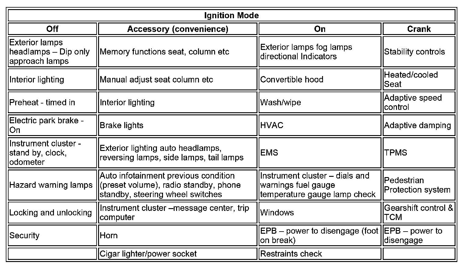 The vehicle has a possible 4 ignition modes. The modes and systems that are active in each mode are detailed in the following table.