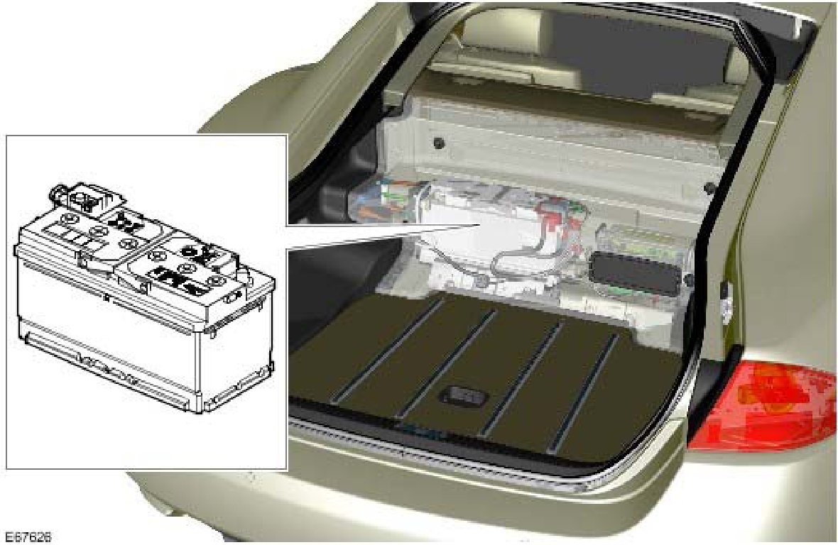 The positive battery cable is also connected to a remote jump start terminal. The remote jump start terminal is located in the Left-Hand (LH) rear corner of the luggage compartment and can be accessed by removing the air vent trim. Although also fitted to coupe vehicles, the terminal has been specifically designed to allow a convertible vehicle to be jump started if a drained battery is experienced when the top is in the stowed condition.