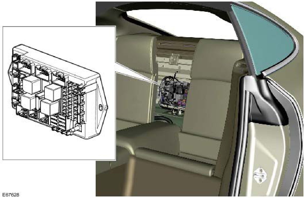 The auxiliary junction box is mounted on the passenger compartment rear bulkhead and secured by 2 nuts/studs. The junction box can be accessed by opening the center panel of the rear seat back. The center panel is secured in position by a single stud at the top, and hinged at the bottom.