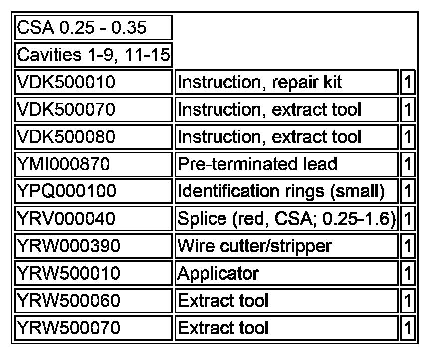 NOTE: Before commencing a repair, refer to the appropriate 'Service Repair Kit' table (see example in Table 1 below) for details of the correct tools and replacement components. The 'Service Repair Kit' table (where appropriate) can be found beneath the 'Connector Details' in the Electrical Reference Library (ERL).