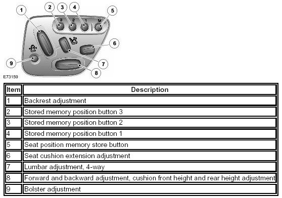 Memory recall has 3 memory positions stored for the seats, steering column and exterior mirrors. The switches for this function are located on driver and passenger door side trim panel. Pressing the appropriate numbered memory switch allows the seat to start moving to the position appropriate to that memory. When the switch is released the system will operate in manual mode. This means that when the switch is released, the seat will stop moving. In order to reach the intended memory position, the switch must not be released until all movement has stopped.