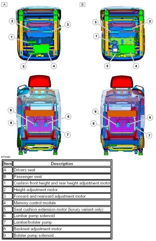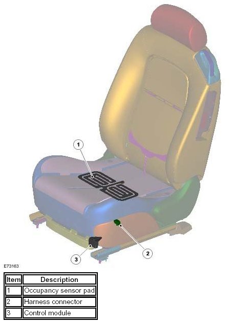 The driver and passenger front seats, although almost identical, have some unique components. The front driver seat has a seat position sensor and the front passenger seat has a occupancy sensing system. In both instances the components form an integral part of the air bag Supplemental Restraint System (SRS).