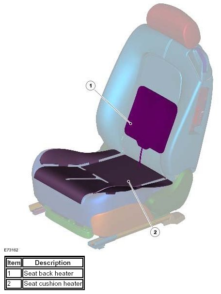 Operation of the heated seats is controlled by the Automatic Temperature Control (ATC) module. The ATC module receives a request from the Touch Screen Display (TSD) and sends a message to the Central Junction Box (CJB), which then provides a feed to the seat heater elements.