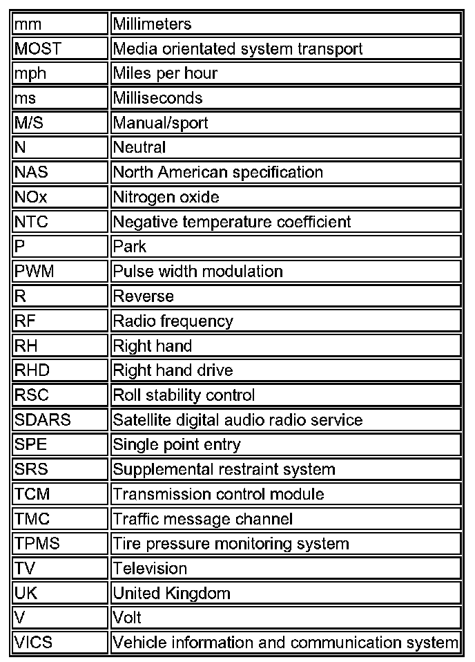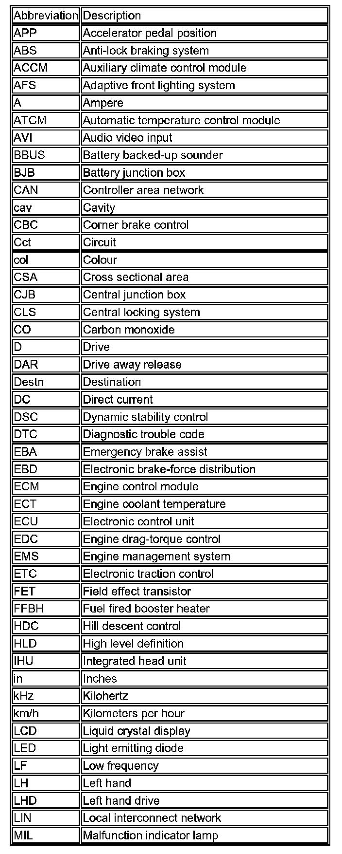 The following list contains wire colour codes used on the vehicle harnesses.