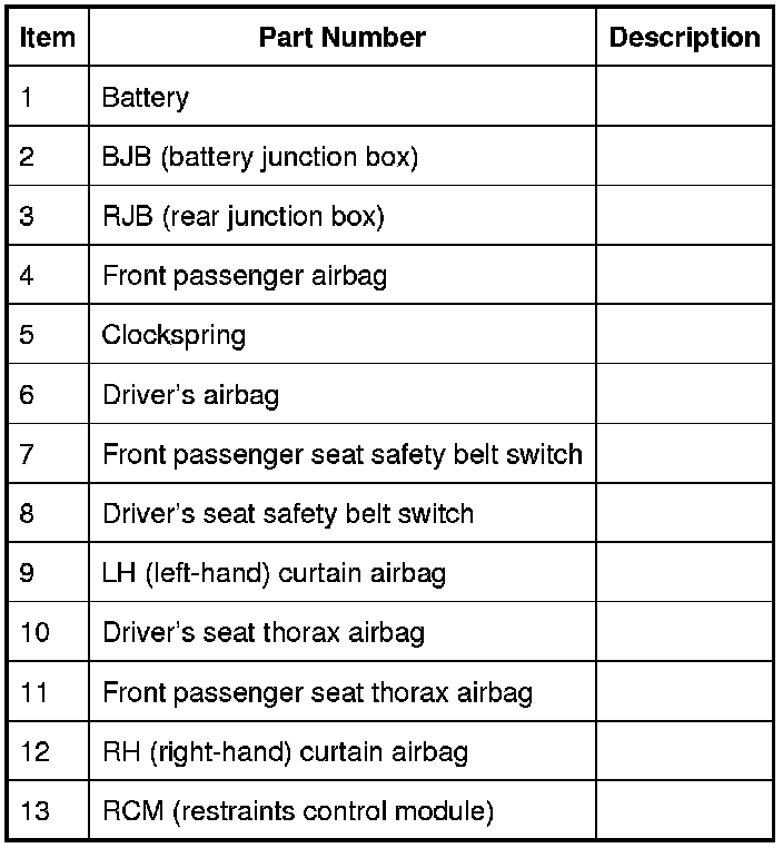 The RCM (restraints control module) drives the SRS (supplemental restraint system) indicator on the instrument pack via a CAN (controller area network) signal. If the warning lamp fails, a fault code is recorded and a warning tone is sounded in place of the lamp if a further fault occurs. It also provides a temporary back-up power supply to operate the air bag modules in the event that in crash conditions, the battery supply is lost. In the event of a crash, it records certain data which can be accessed via the diagnostic connector.