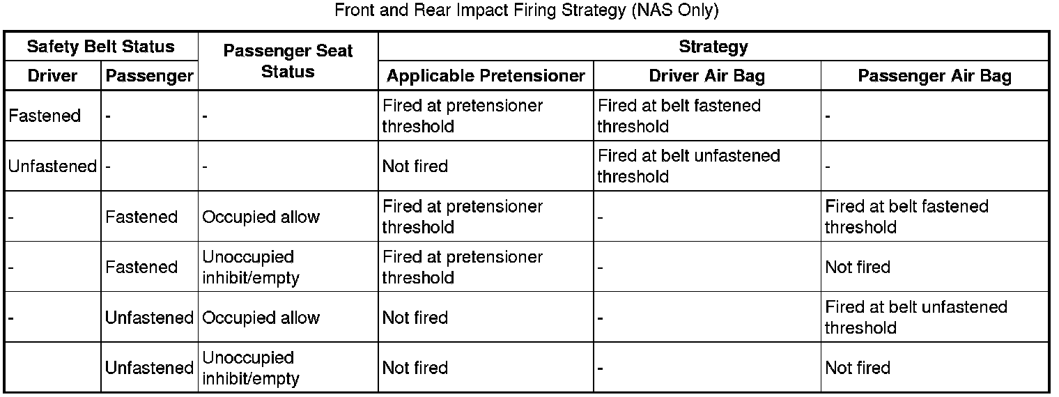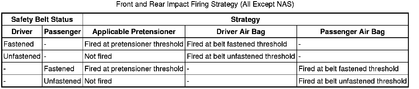 The driver and passenger air bags are only fired in a frontal impact. If an impact exceeds a stage 1 limit, but is less than the corresponding stage 2 limit, only one inflator in each air bag is fired (stage 2 is still fired for disposal after a delay of 100ms). If an impact exceeds the stage 2 limit, the two inflators in each air bag are fired simultaneously.
