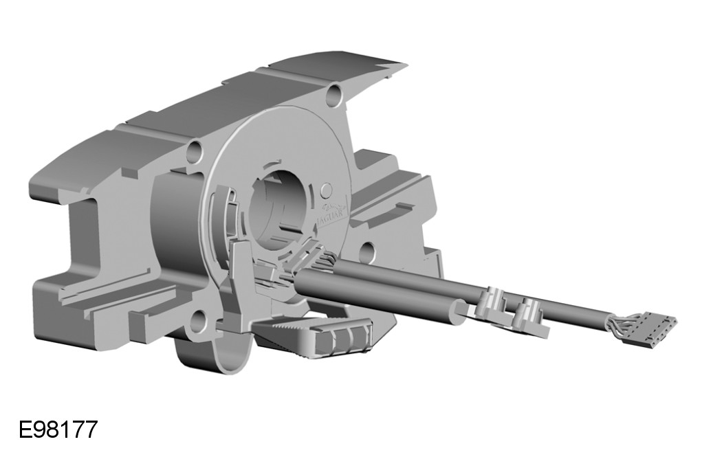 The clockspring consists of a plastic cassette which incorporates an outer cover fixed to the steering column and an inner rotor which turns with the steering wheel. Four securing lugs attach the cover to the multifunction switch on the steering column. The rotor is keyed to the steering wheel by a drive peg. A lug on the underside of the rotor operates the self-canceling feature of the turn signal indicator switch. A ribbon lead, threaded on rollers in the rotor, links two connectors on the cover to two connectors on the rotor. Link leads for the driver air bag are installed in one of the connectors on the rotor.