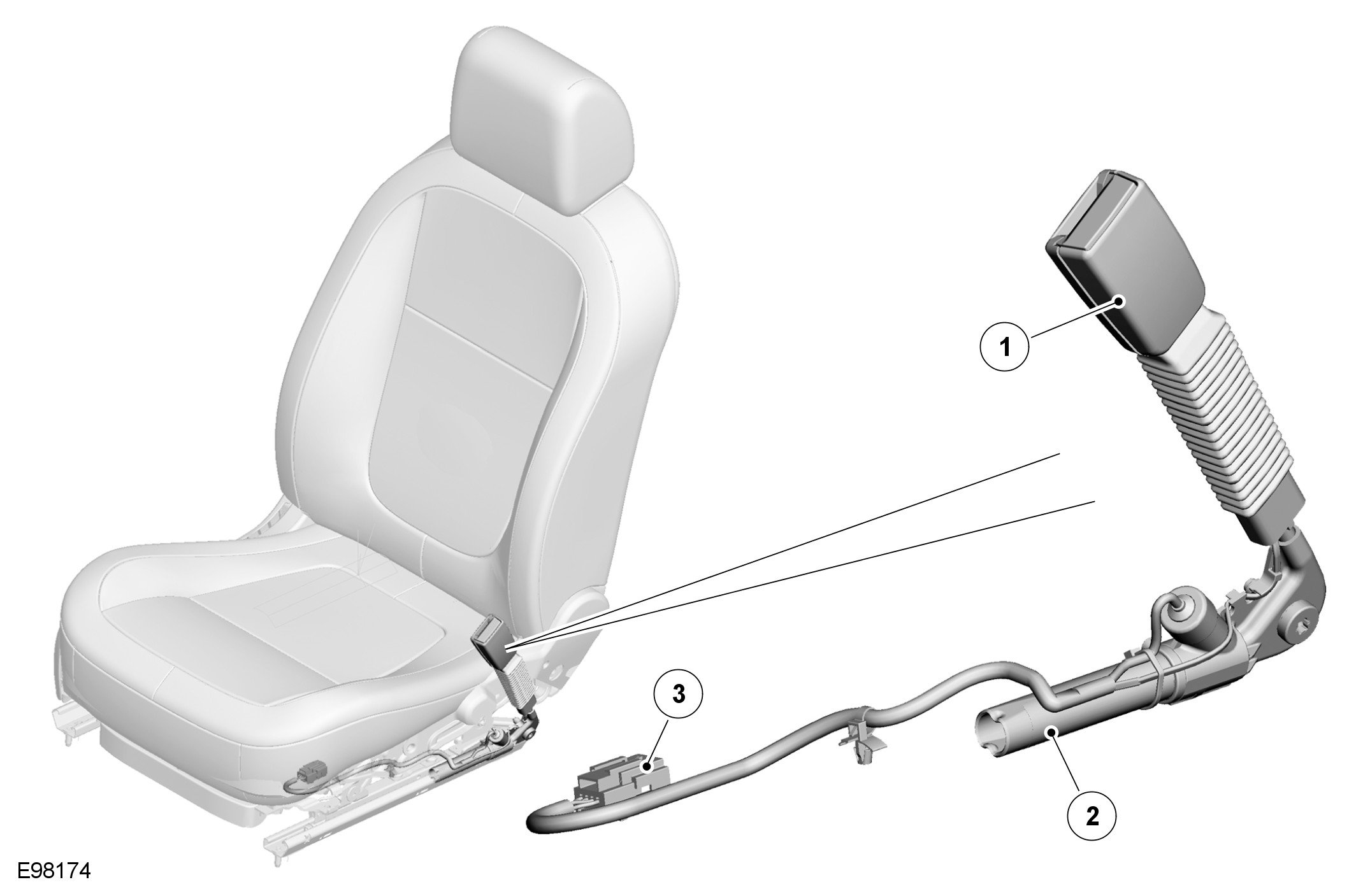 The pretensioners are used to tighten the front safety belts during a collision to ensure the occupants are securely held in their seats. A pretensioner is integrated into each front safety belt buckle and attached to a bracket on the inboard side of the seat.