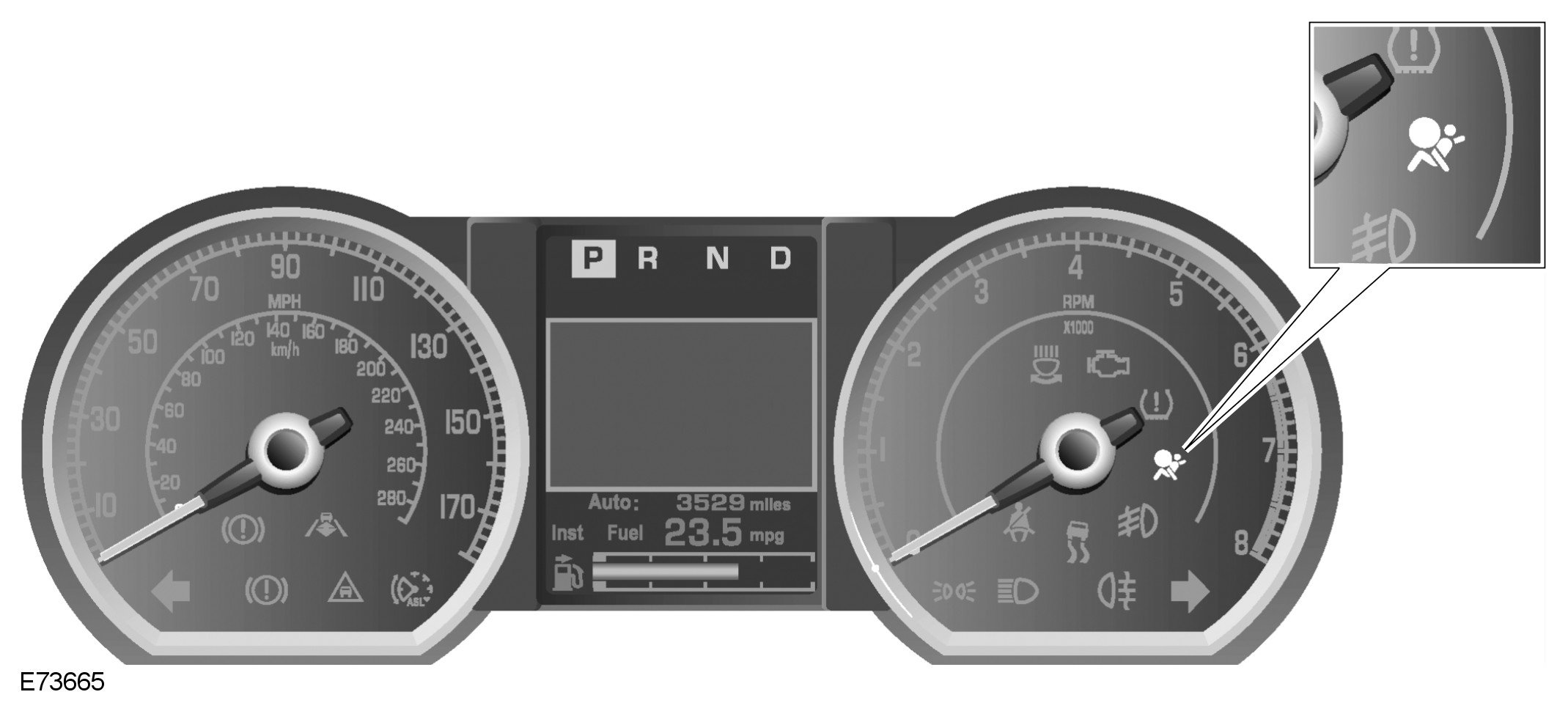 The air bag warning indicator consists of a red LED (light emitting diode) behind a SRS (supplemental restraint system) graphic in the instrument cluster.