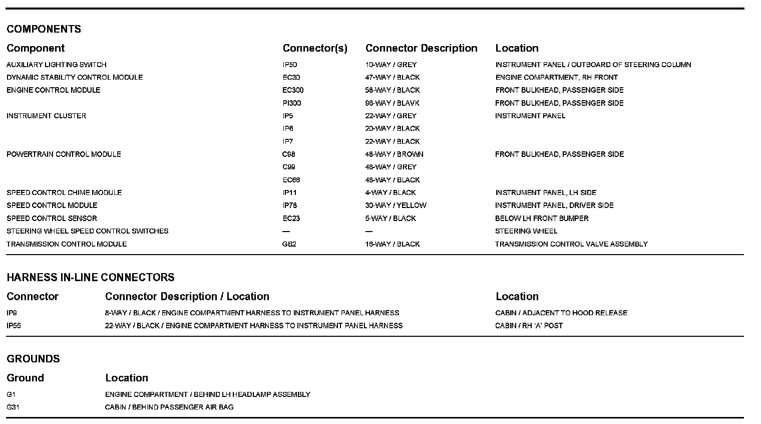 Locations: The location views for Ground Points, In-Line Harness Connectors, Harnesses, and Control Modules depicted within these diagrams can be found at Vehicle/Locations. Locations