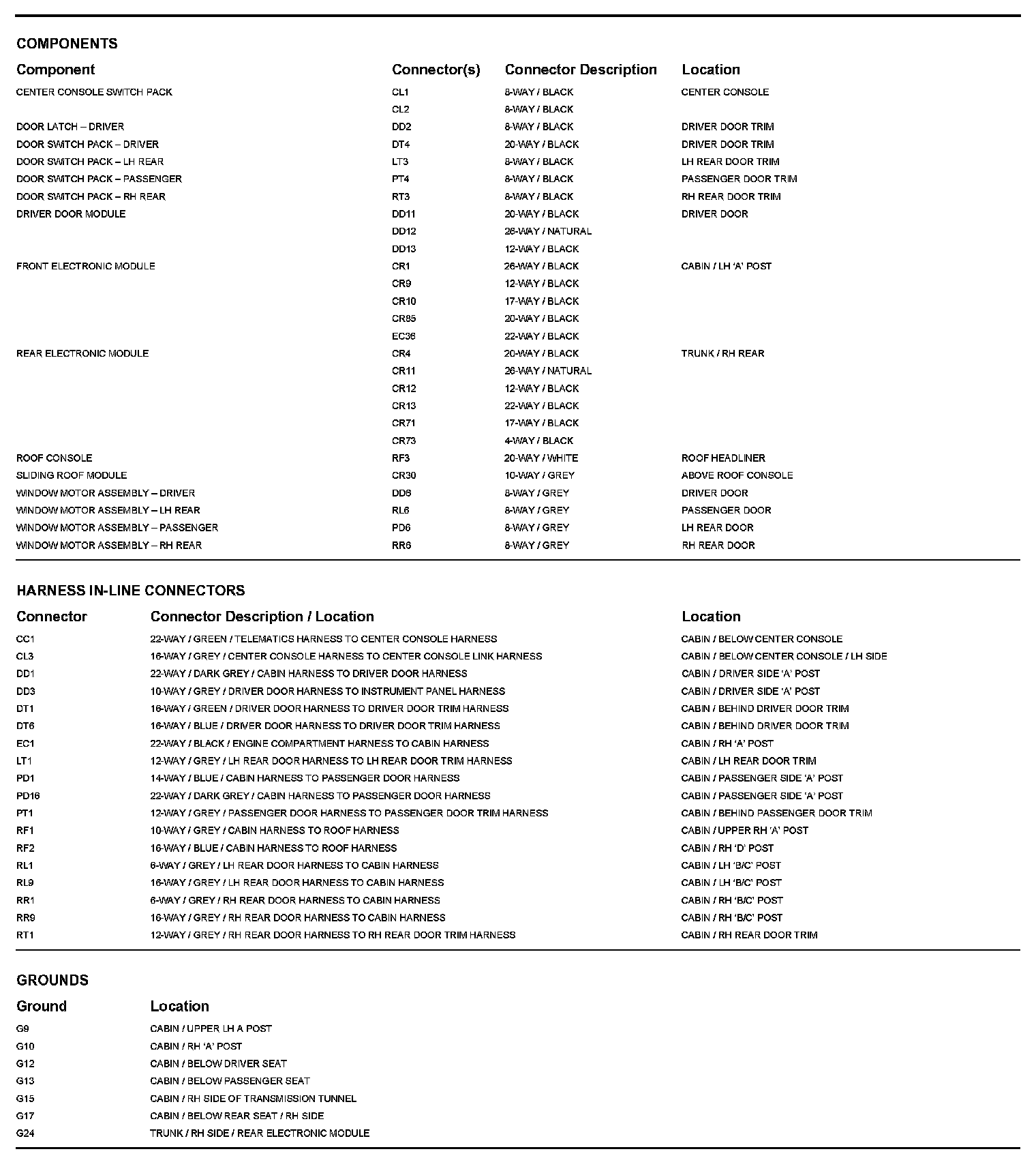 Locations: The location views for Ground Points, In-Line Harness Connectors, Harnesses, and Control Modules depicted within these diagrams can be found at Vehicle/Locations. Locations