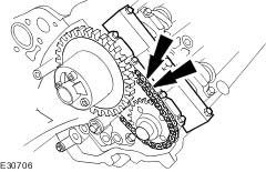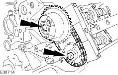 ^ Install the secondary timing chain tensioner and secondary timing chain to the camshaft sprockets.