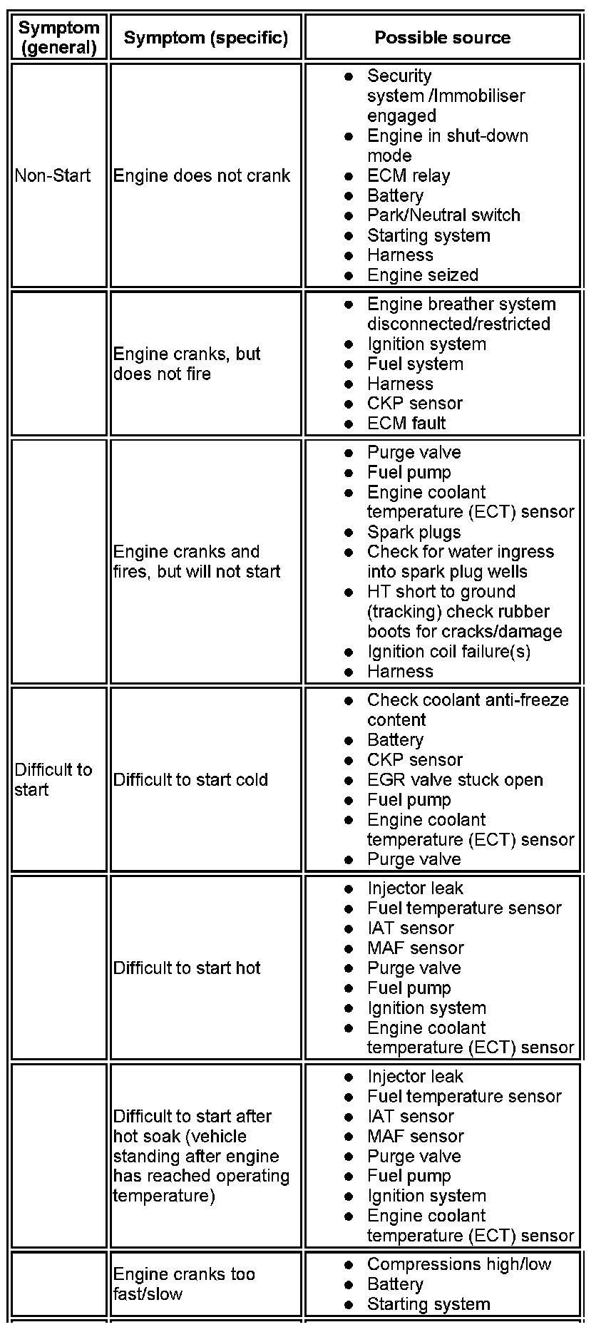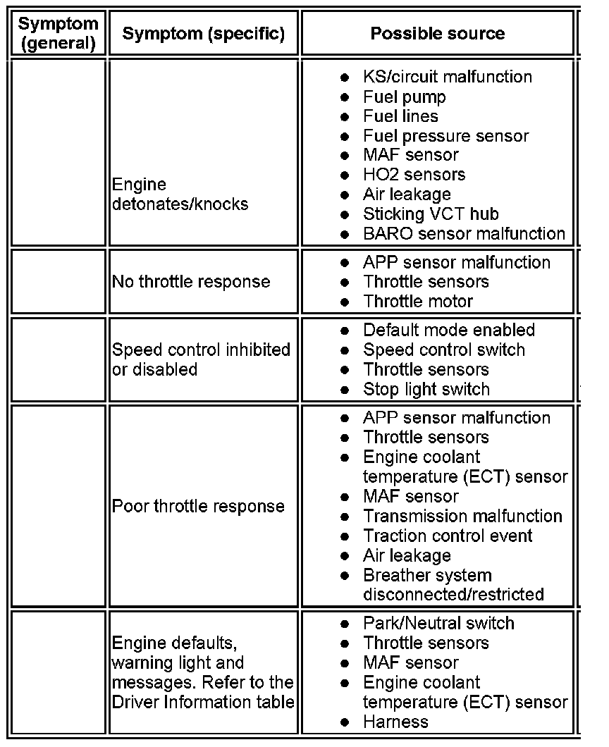 NOTE: If any warning lights and/or messages were displayed when the fault occurred, refer to the driver information table for Diagnostic Trouble Codes (DTCs) associated with the display, then to the DTC index table for possible sources and actions. Some warnings will appear to clear when the ignition is cycled. This is often because the warning has flagged as a result of one of the vehicle's on-board diagnostic routines having run to detect the fault. If the same routine is not run when the ignition is switched ON, the warning will not reflag until the routine does run. See the DTC summaries for drive cycle routines.