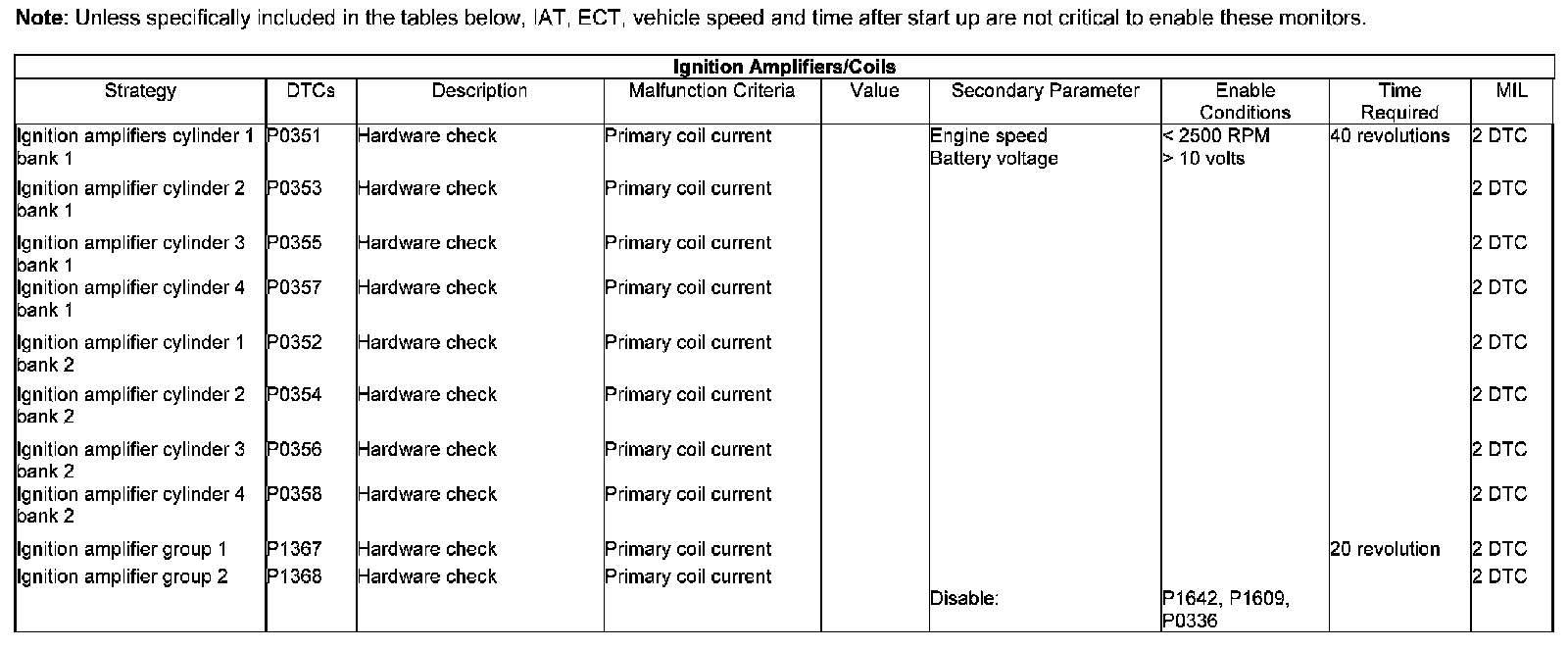The ignition amplifiers monitor is very similar in operation to the injectors monitor, albeit with different enable conditions. Please refer to the fuel injectors monitor explanation. The ignition amplifiers have two monitor lines that carry multiplexed ignition amplifier monitor signals whereas the injectors can be monitored individually. It is for this reason that the ignition amplifiers monitor does not operate over such a wide range of engine speeds as the injectors monitor.