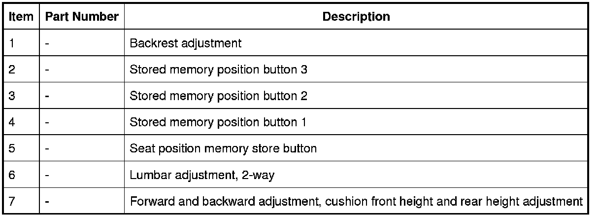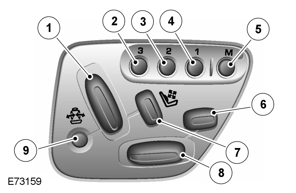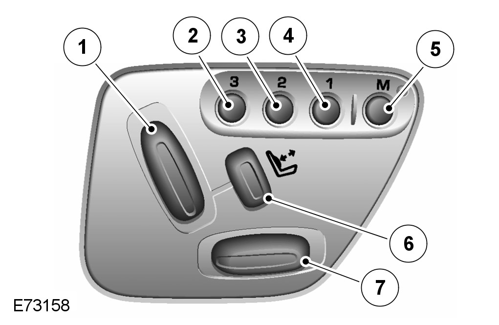 Memory recall has 3 memory positions stored for the seats, steering column and exterior mirrors. The switches for this function are located on driver and passenger door side trim panel. Pressing the appropriate numbered memory switch allows the seat to start moving to the position appropriate to that memory. When the switch is released the system will operate in manual mode. This means that when the switch is released, the seat will stop moving. In order to reach the intended memory position, the switch must not be released until all movement has stopped.