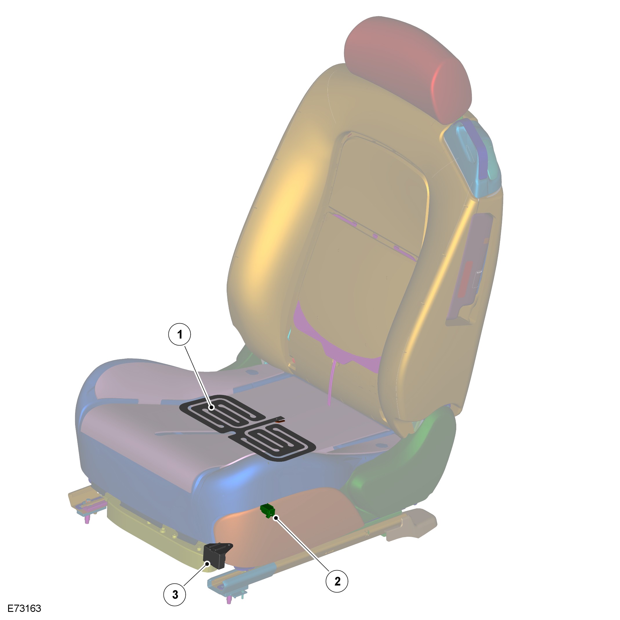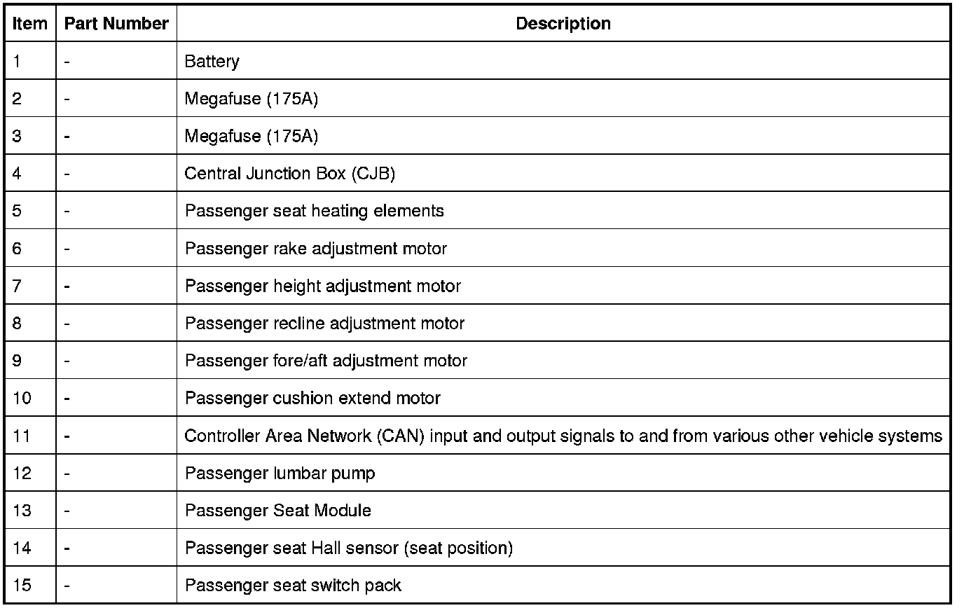 Operation of the heated seats is controlled by the Automatic Temperature Control (ATC) module. The ATC module receives a request from the Touch Screen Display (TSD) and sends a message to the Central Junction Box (CJB), which then provides a feed to the seat heater elements. For additional information, refer to Control Components Control Components
