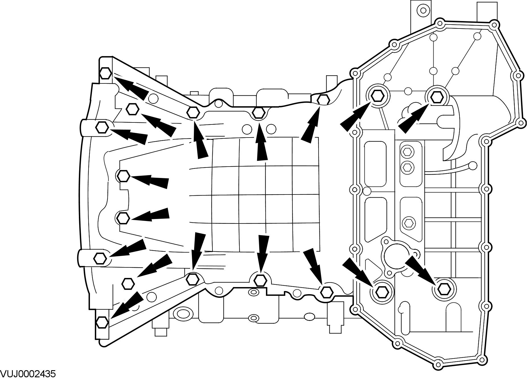 - Remove the lower cylinder block retaining bolts in the indicated sequence.