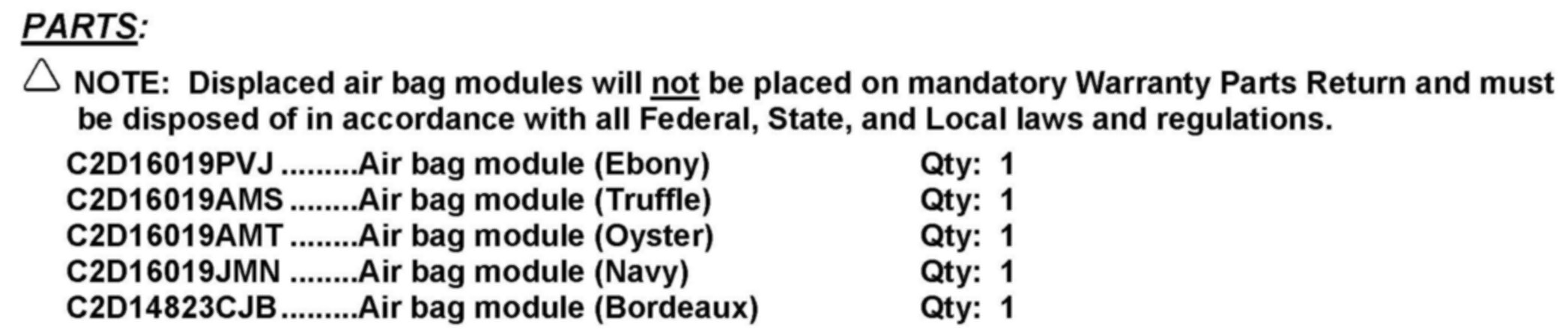 Displaced air bag modules will not be placed on mandatory Warranty Parts Return and must be disposed of in accordance with all Federal, State, and Local laws and regulations.