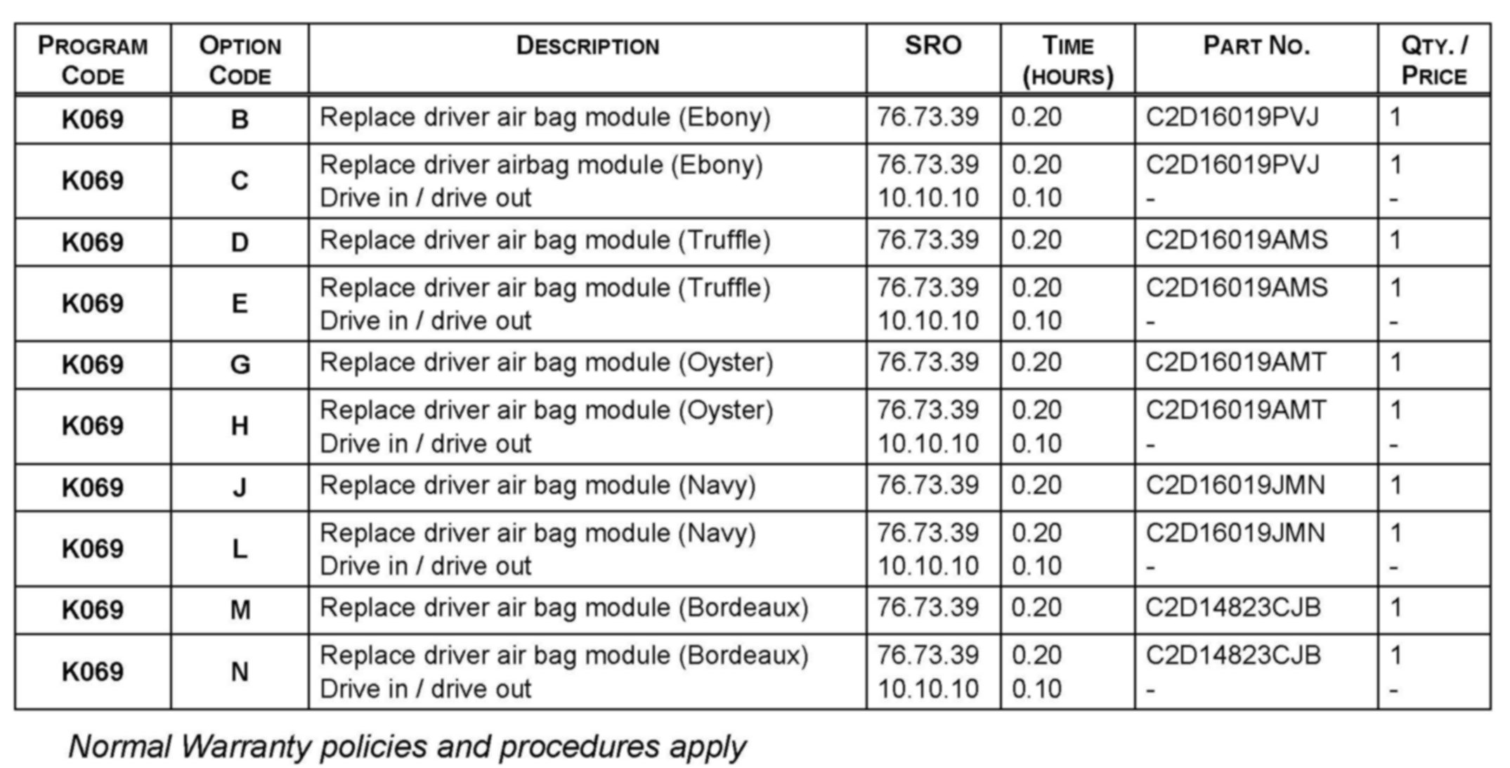 Dealers are required to update all affected vehicles within their control and withhold them from retail delivery pending completion of the rework actions detailed in this bulletin. Affected vehicles in the hands of owners should be repaired at the next available opportunity. At the time of customer appointment, ensure that all outstanding service campaigns for each individual vehicle are identified and allocate sufficient time and resources to complete all campaigns. Refer to the Repair Procedure outlined below to replace the driver's air bag module.