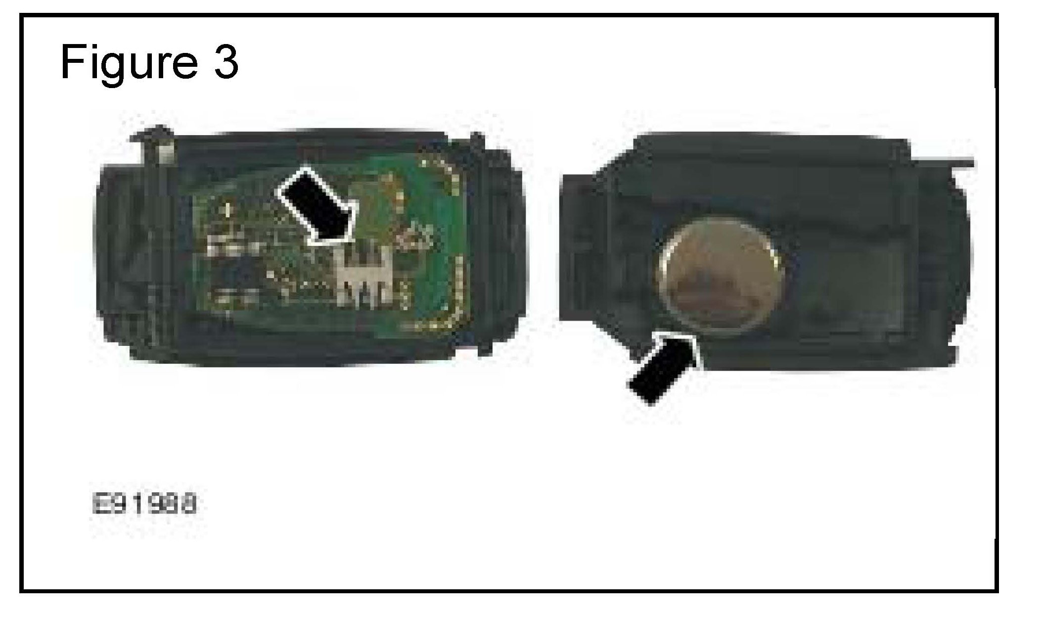 The green printed circuit board, battery or the battery contacts (arrowed in Figure 3) may NOT be touched during the work procedure. Oil or contamination on either can affect the key fob performance.