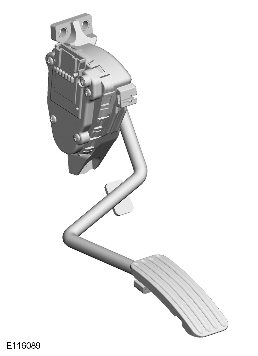 The APP (accelerator pedal position) sensor is installed on the pedal box and secured with three screws. A six pin electrical connector provides the interface with the vehicle harness. The accelerator pedal is connected to a spindle on the RH (right-hand) side of the APP (accelerator pedal position) sensor.