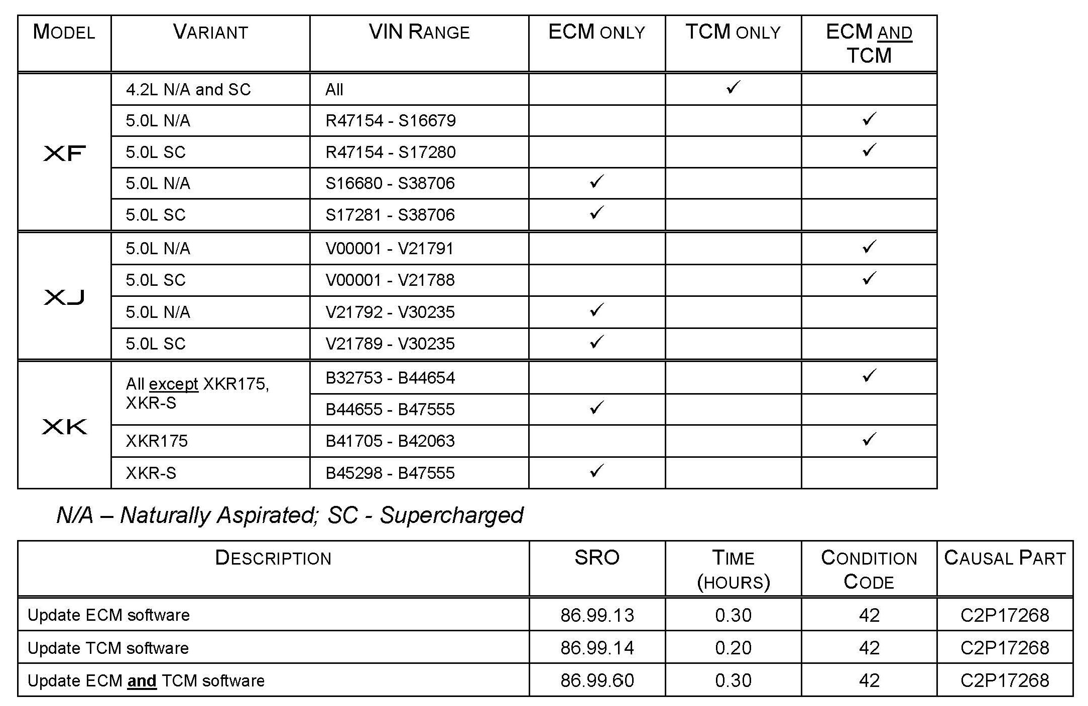 the ECM and TCM software. Refer to the table below to determine which control module(s) require updating.