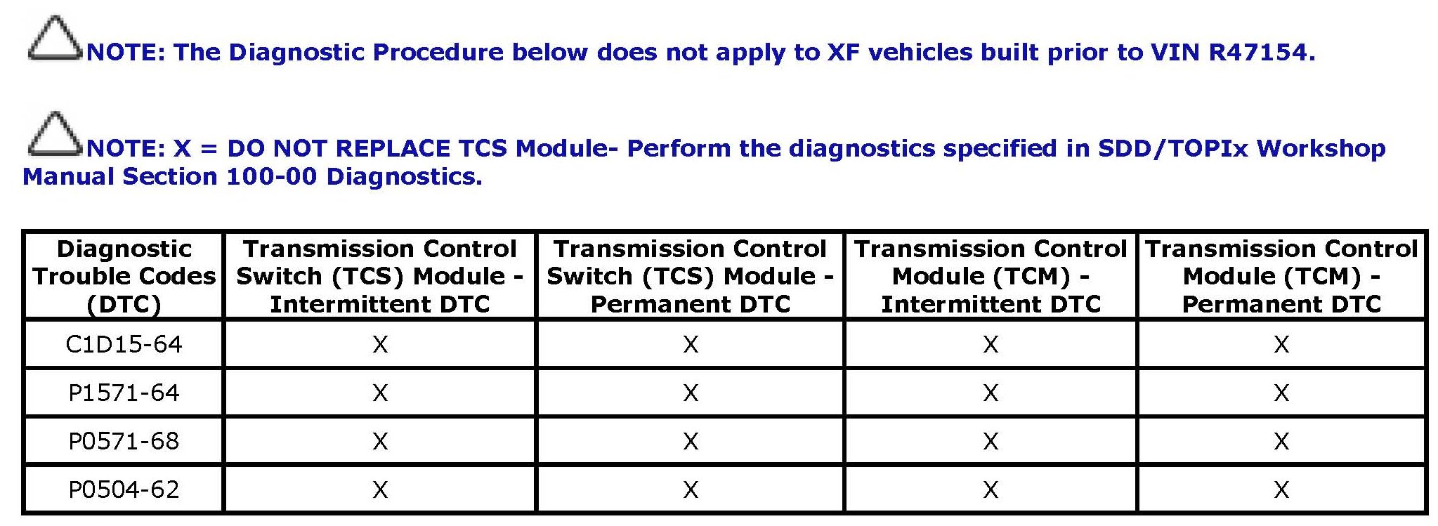 Use the Diagnostic Trouble Codes (DTC) table below for the Transmission Control Switch (TCS) module fault diagnosis.