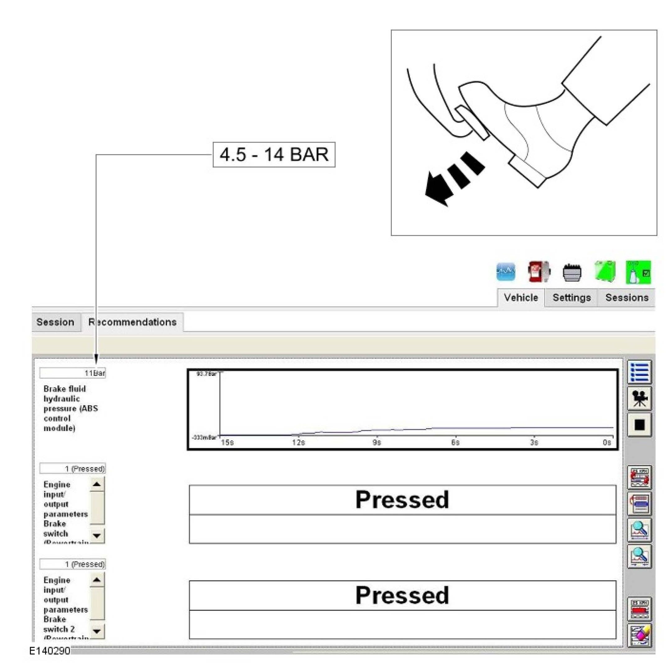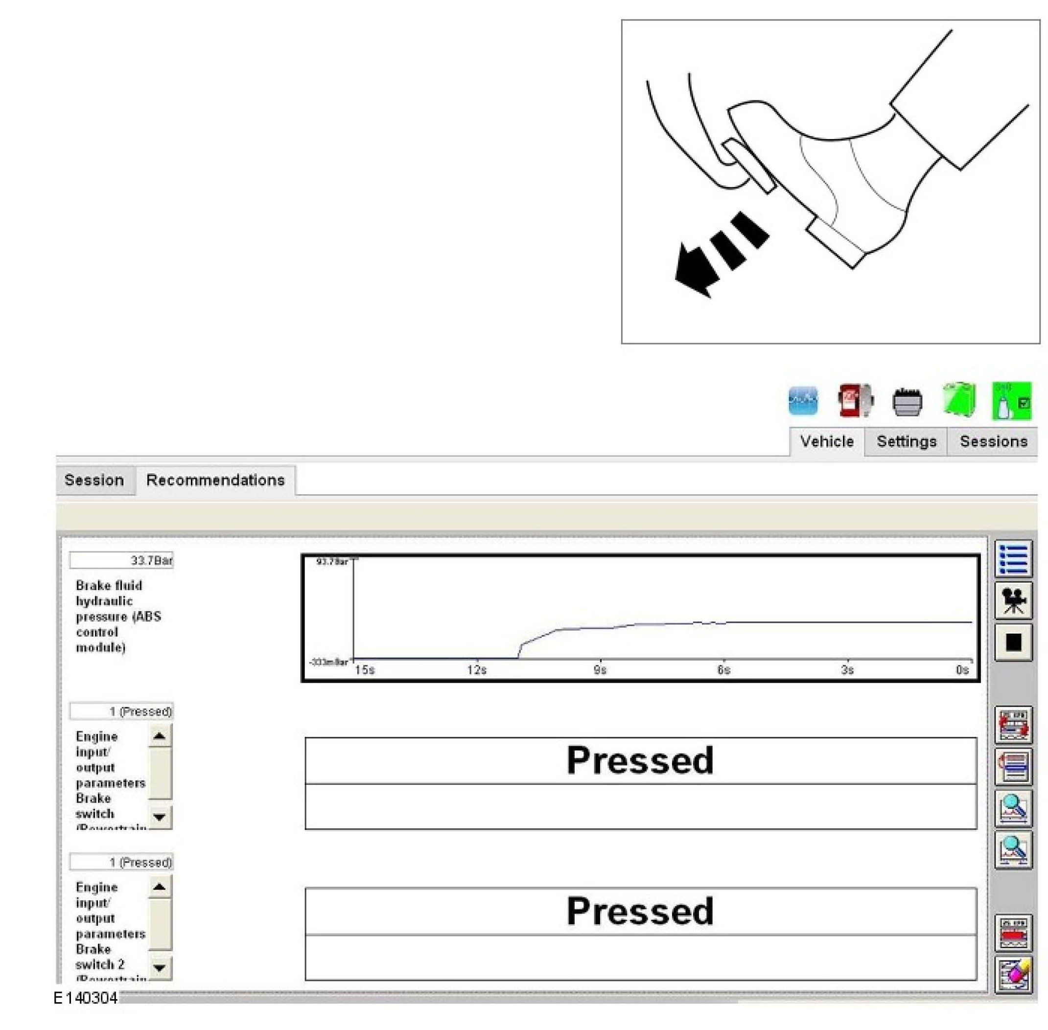 ^ The first graph to change must be the brake light switch (confirm by asking someone to watch brake lights come on). The brake pressure applied, shown in the top bar chart, should be between 1 and 7 BAR.