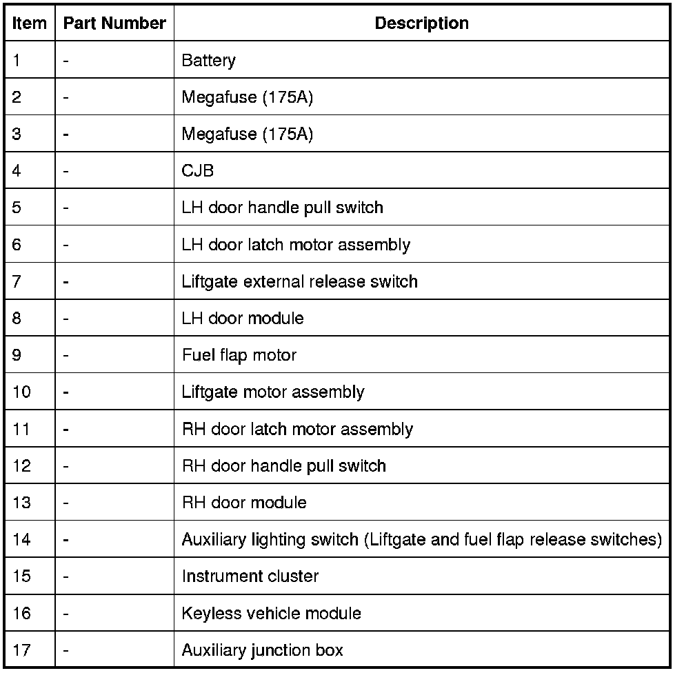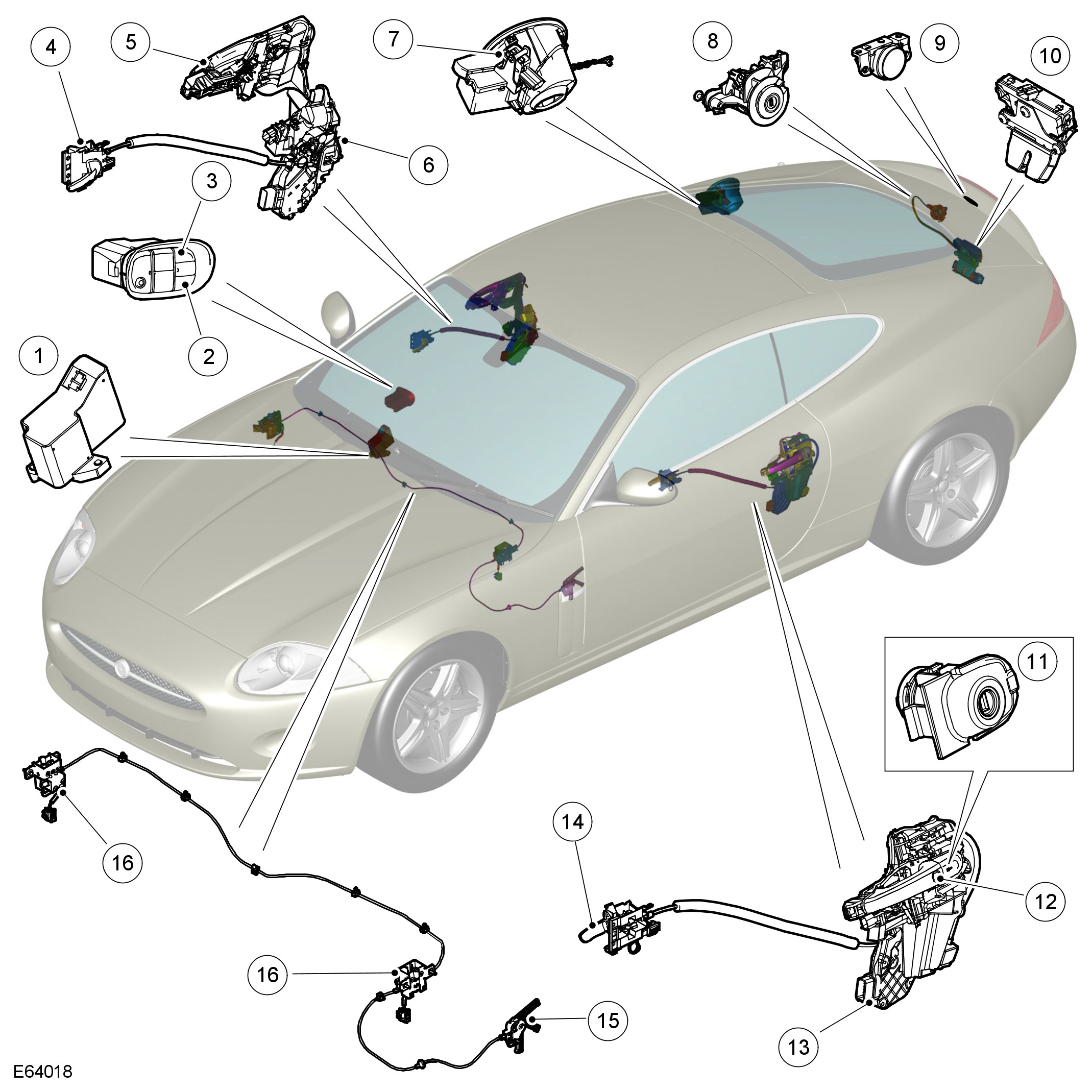 The door latches are located at the rear of each door and engage with a striker on the 'B' pillar. Each door latch motor assembly contains microswitches for lock and unlock and door ajar. Two motors provide for the central door locking and the double locking feature. The electrical control for the door latch components is provided by the CJB and auxiliary junction box via the driver's and passenger door modules.