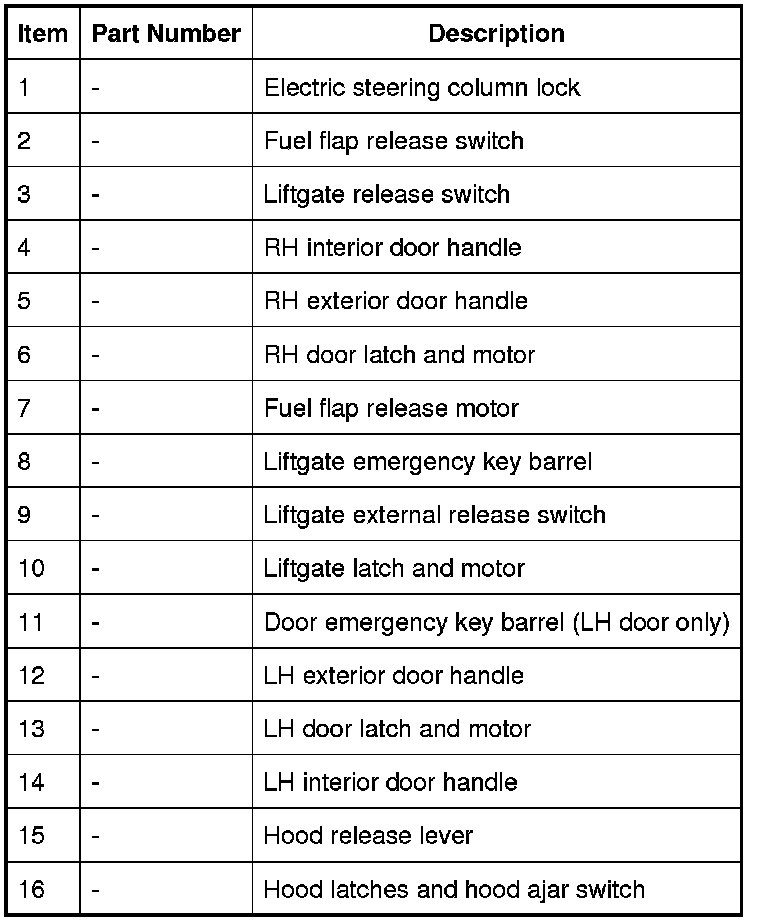 The liftgate latch is attached to the bottom of the liftgate. The latch can be released electrically by pressing the interior release button located in the auxiliary lighting switch, the exterior release button located in the license plate finisher or the liftgate release button on the Smart Key. On North American Specification (NAS) vehicles an emergency release cable is attached to the latch. This allows the latch to be manually opened by pulling a handle located in the liftgate interior trim.