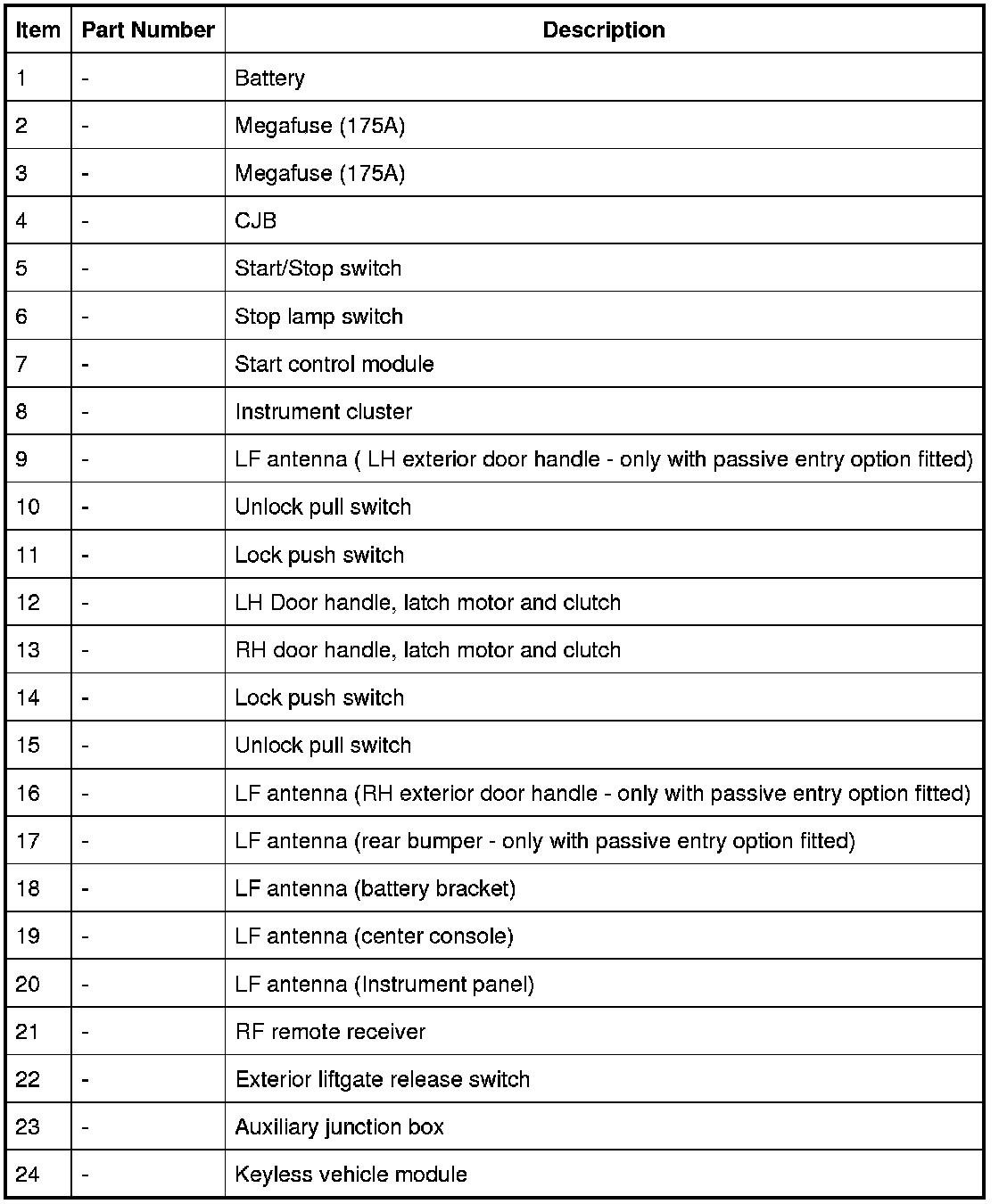 A new Passive Entry and Passive Start system is introduced. This system allows the driver to unlock and start the vehicle without using a vehicle key in a door lock or ignition switch. The passive entry system is an optional fitment. The passive start system is a standard fitment on all vehicles and allows the driver to start the vehicle without the use of a vehicle key. The system is combined with the passive anti-theft immobilization system. For additional information, refer to Anti-Theft - Passive
